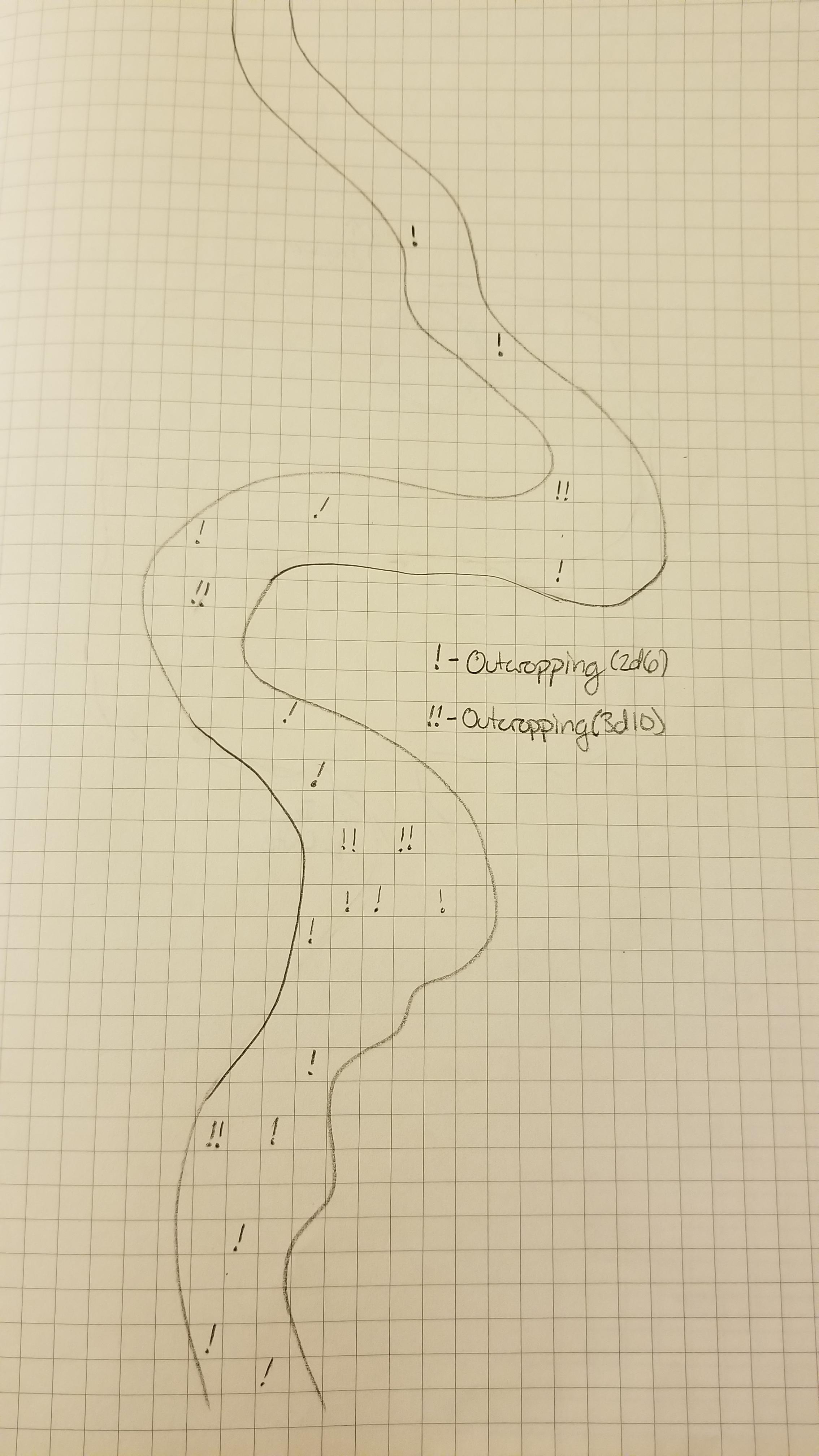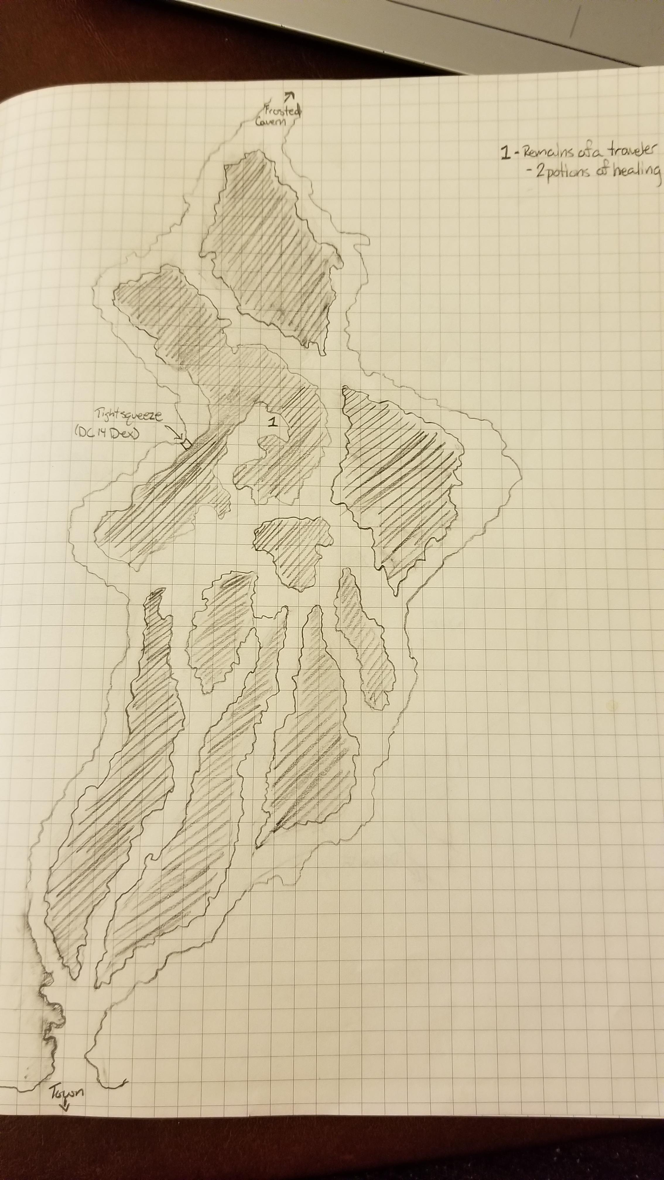 There are icy outcroppings at places that if slid into will deal 2d6 bludgeoning damage (noted by a ! mark), or launch the player into the air, risking 3d10 piercing damage as they collide with icy stalactites (noted by two !! marks). A character must make a DC 14 Dexterity saving throw to avoid colliding with an outcropping if their forced movement would have them collide with one. A player may pre-emptively make a DC 12 Acrobatics check to attempt to slide in either direction to move out of the way of an incoming outcropping.