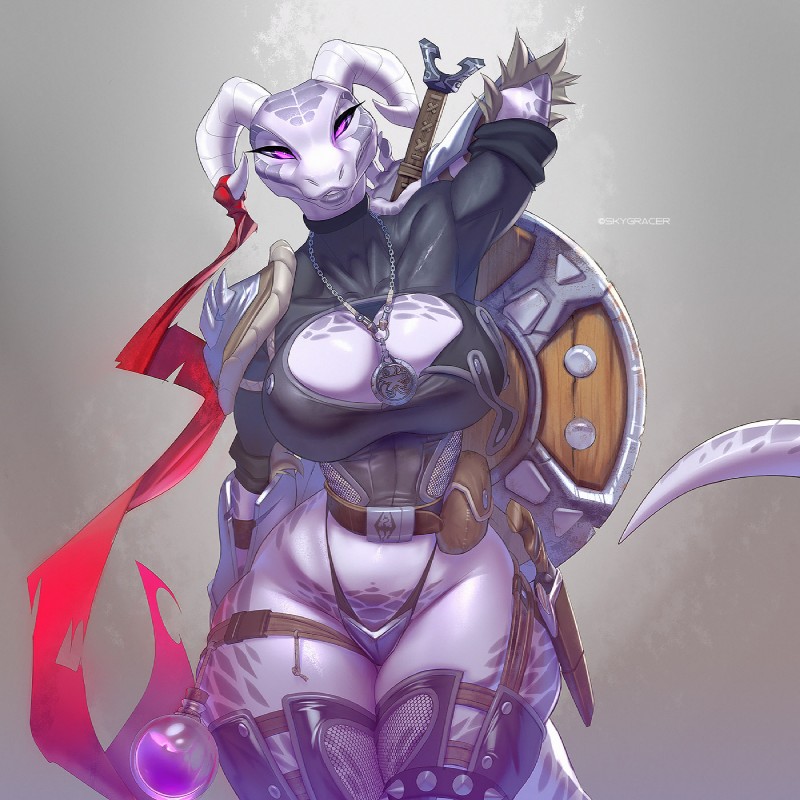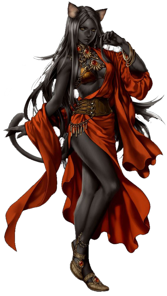 Versha is depicted as a dark-skinned catfolk with amber eyes and bejeweled golden robes that show off her shapely hips. Some have said to have spotted her walking amongst the dunes with a scorpion's tail.