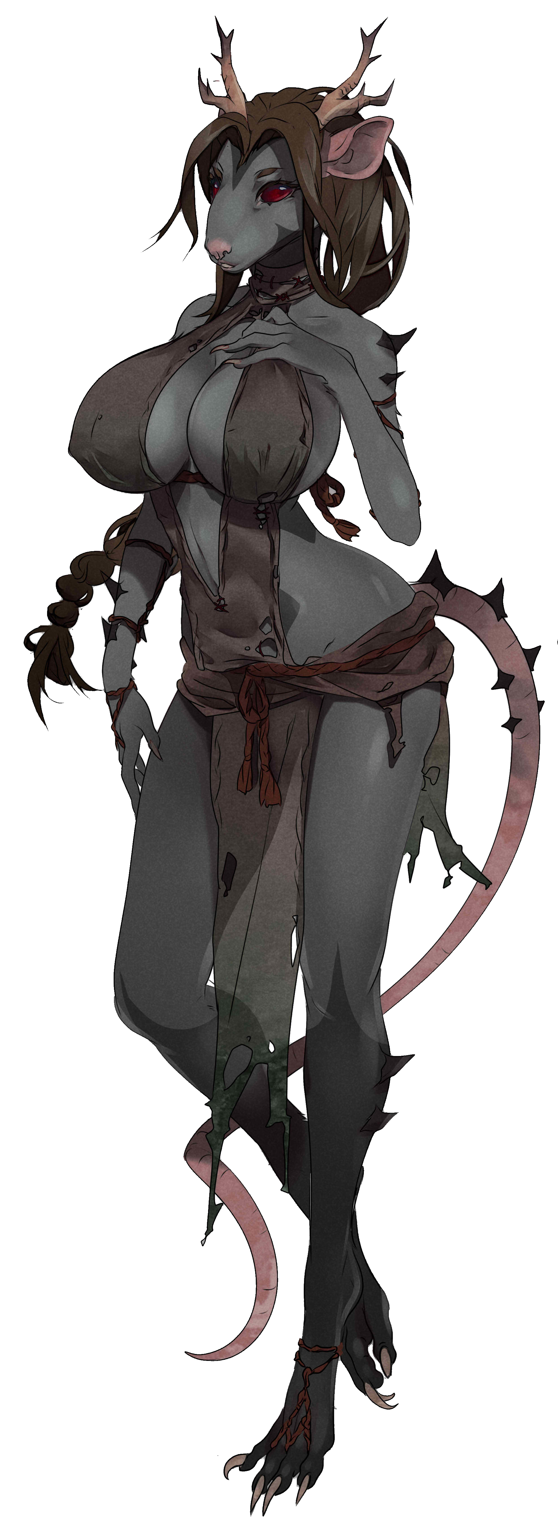 Morne is depicted as a woman with numerous chains and locks across her body, and silver nipple rings hanging from her large breasts.