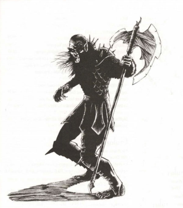 A gulor combines the worst features of its two progenitors, savage orc and bestial wolverine. Standing upright like an orc, the gulor possesses the claws and nasty disposition of the wolverine. Orcish skin coloration and facial features struggle for supremacy with an animalistic muzzle filled with sharp teeth and the dark brown or black flur that covers its head, lower arms, and shins. Observing these creatures in battle, it is often difficult to determine which of the two creatures it favors most.