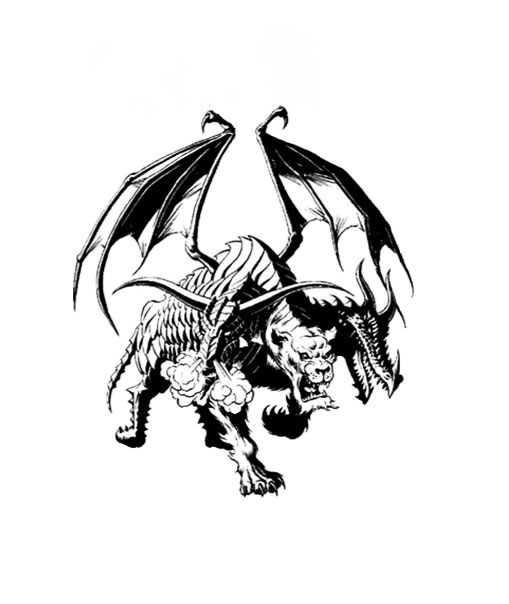 This entry was inspired by the gorgimera, which originally appeared in the First Edition module S4 Lost Caverns of Tsojcanth (© TSR/Wizards of the Coast, 1982) and later in the First Edition Monster Manual II (© TSR/Wizards of the Coast, 1983).