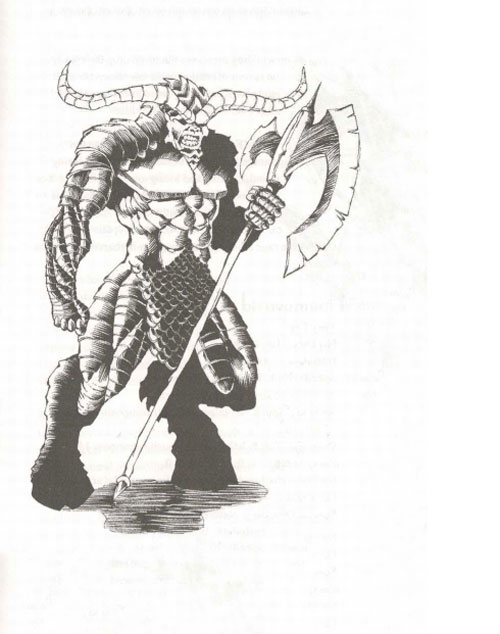 Gulor tribes are most often found living by themselves, but occasionally work with orcs. They speak a guttural form of the orc tongue. Despite their bestial appearance, gulors are adept at weapon use and often wear scale mail armor. They enter battle weilding greataxes but often drop their weapons in favor of rending their enemies with teeth and claws, especially once their famed battle rage overcomes their sensibilities.