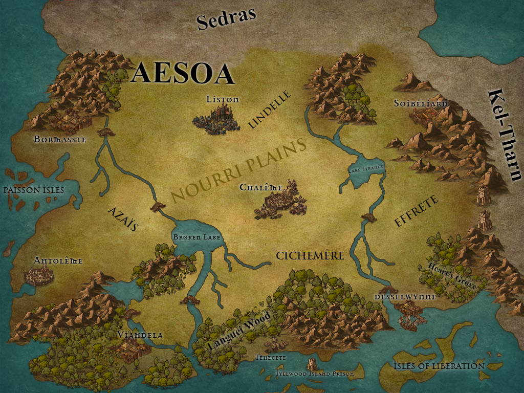 Aesoa is located on the southwestern corner of the continent of Goldrun. It is surrounded by Sedras, the nation of free cities to the North, and the ravaged land of Kel-Tharn to the east.