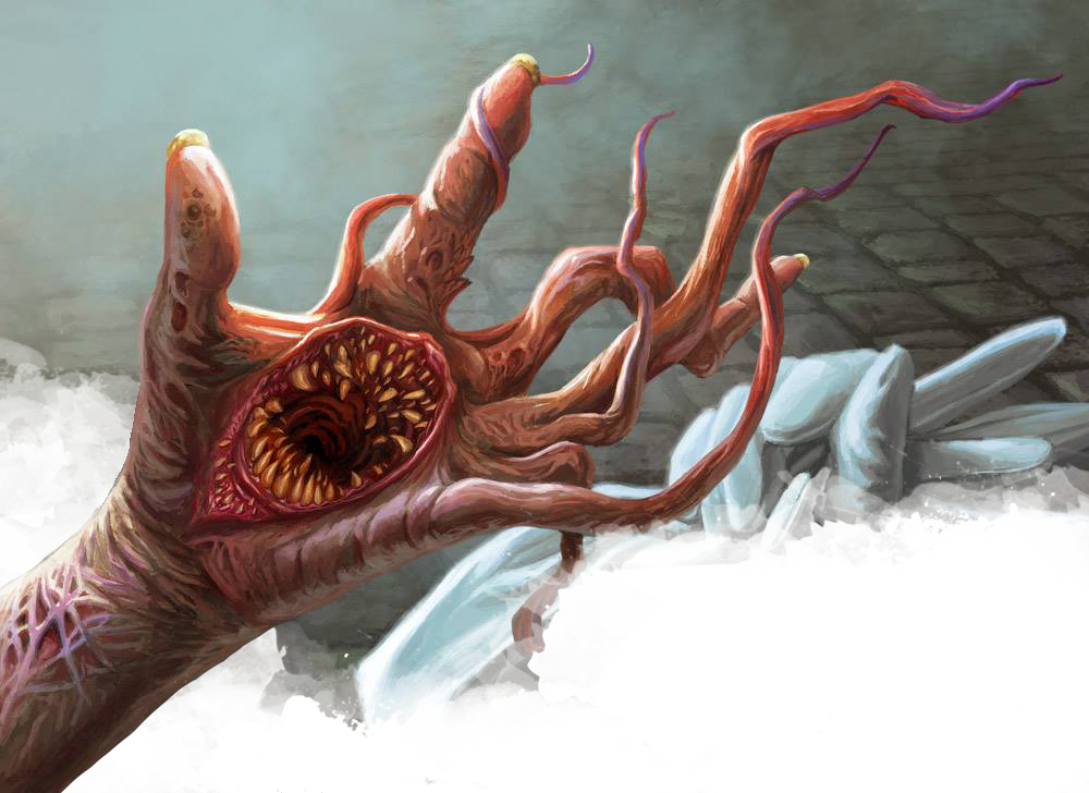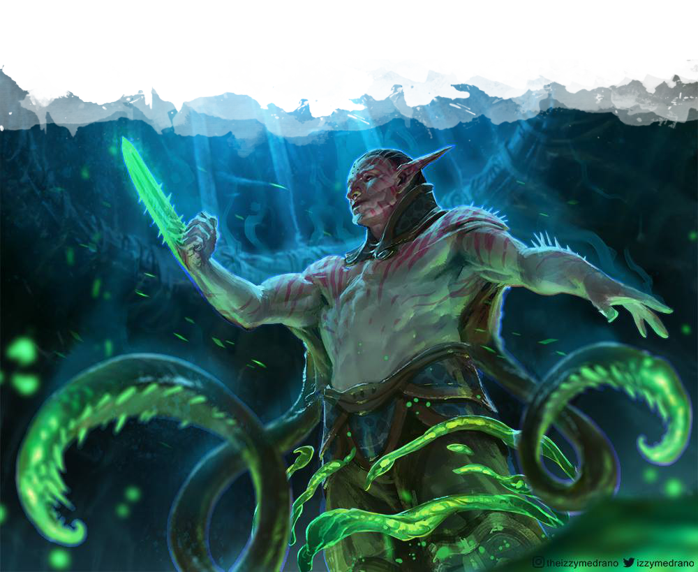 A half-elven woman covered from head to toe in black robes is confronted by a group of bandits in a dark forest. As they make their demands, she stares at the ground, refusing to make eye contact with them. One of the bandits draws a sword, but before he can take a single step he is abruptly lifted high into the air. The others look on in horror as monstrous tentacles lash out from the woman, grasping him by the throat.