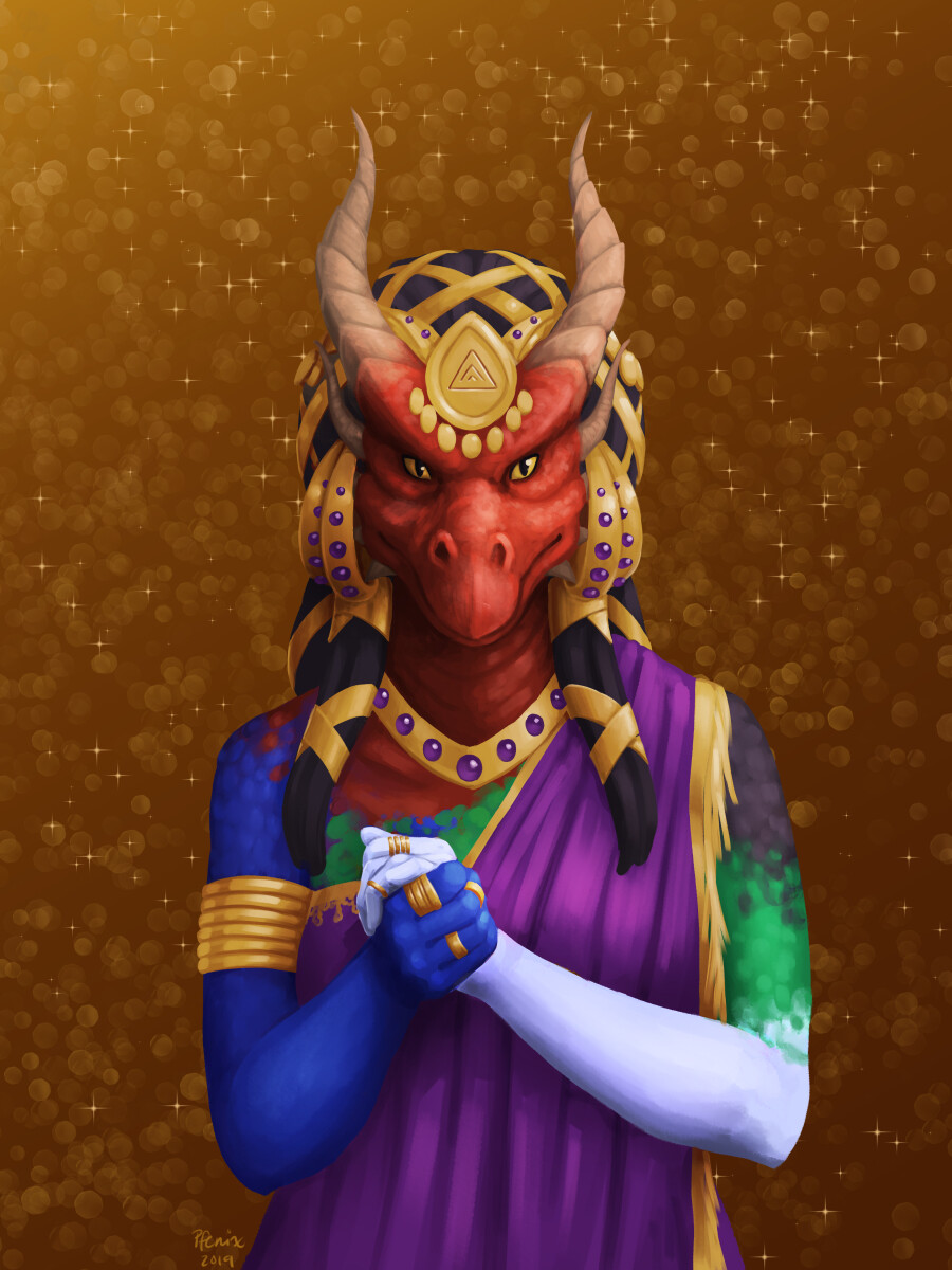 Tiamat's humanoid avatar appears as a regal dragonborn woman with different colored scales across her body. She wears golden jewelry and a rich purple robe with long golden fringe, and her eyes appear to glitter like polished gems.