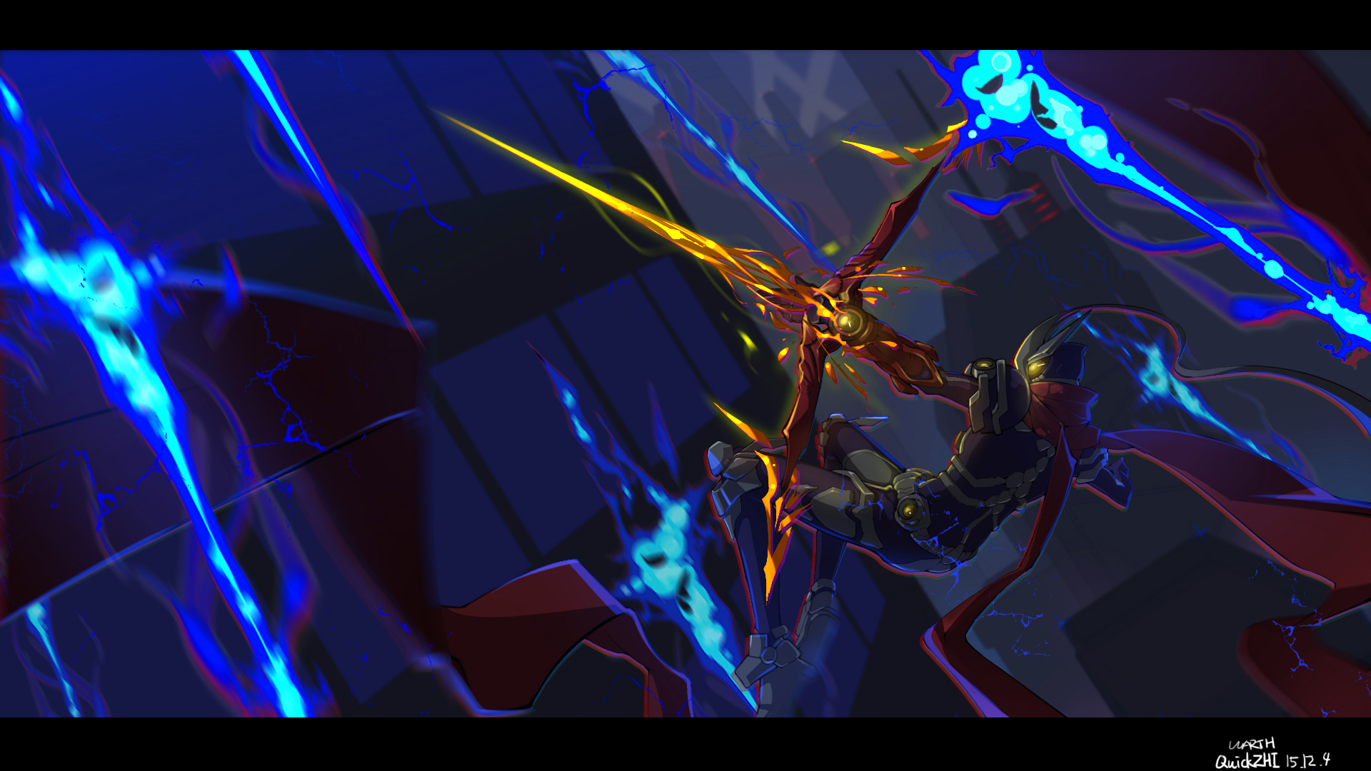 Uttering a command-phrase, a red suit of armor begins to manifest around the mysterious stranger. As the armor-pieces join together in perfect harmony, an audible melody rings in the air, as if heralding the arrival of a saviour. When the tune finally ends, the crimson knight unsheathes a flaming blade.