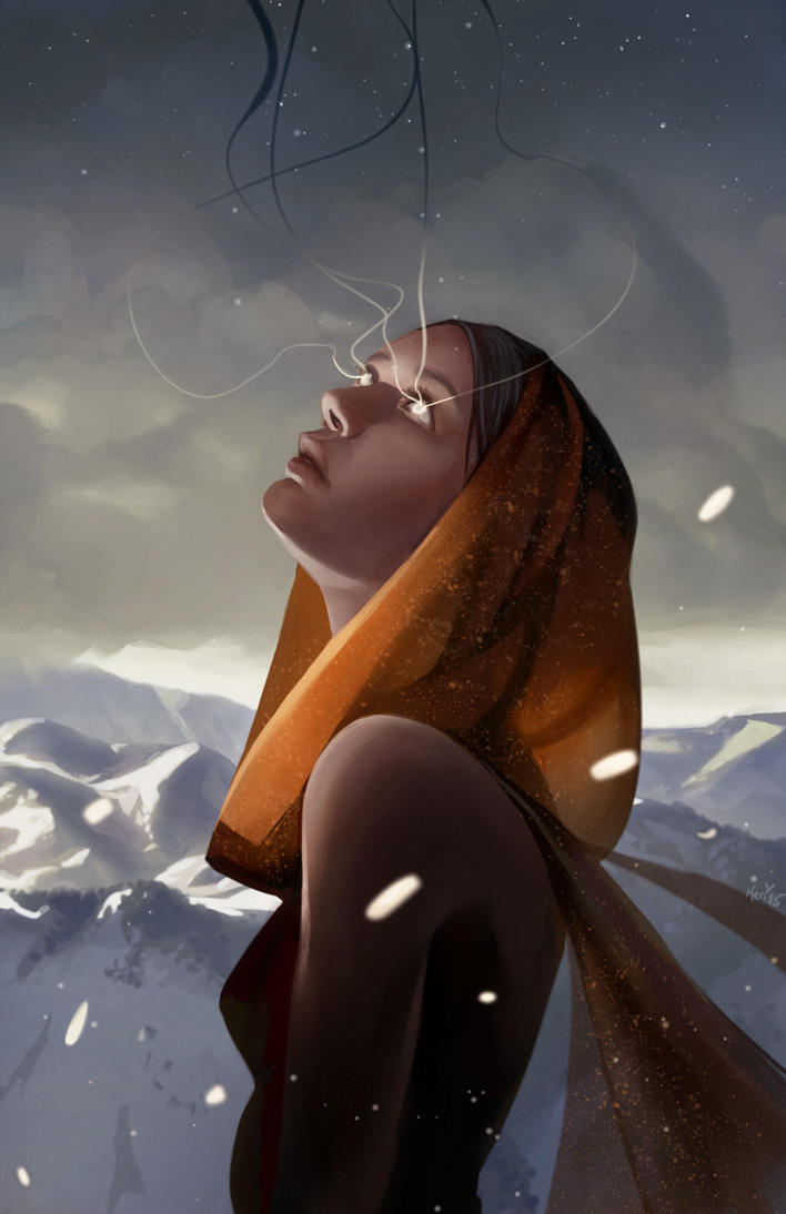 A woman walks through dreams. She seeks the one from her own visions — she has an important message to bring. When she finds the magistrate in her dreams, she whispers the portentous message and is pulled back to wakefulness. A rush of divine ecstasy enfolds her and she feels her own stresses melt away. She rises to a new day, seeking other calamities and misfortune she might prevent.