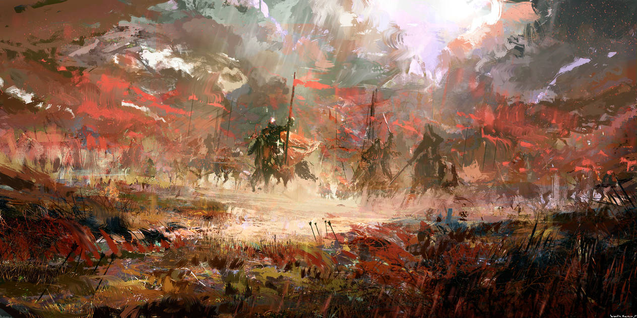 A human with spiky red hair stands in front of his army, his troops facing opposite another military, a vast desert separating the two groups. The man leaps onto his black horse, draws a blade, and points it towards their foes, charging with his allies right on his back.