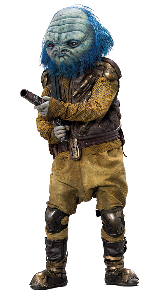 Klatooinians are humanoids known for their stub-nosed, dog-like faces, and their elongated canine teeth which protrude from the corners of their mouths. Apart from their faces, Klatooinians are very humanlike and have fully opposable thumbs on their five-fingered hands. Their unique facial structure allows for higher levels of olfactory sensitivity, making Klatooinians great bounty hunters, able to sniff out their target. Neither male and female Klatooinians have hair, the arid climate of their homeworld making the growth of heavy hair intolerable.
