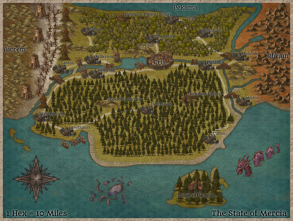 A monarchy like its northern neighbor, Rhejan is 70,000 citizens strong, of mostly dwarves, but also Drow, Firbolg, and Gnomes. Mercia has enjoyed close relationships with Rhejan for generations, trading them the food and wood-based items that they need in exchange for the most finely crafted metalwork in the lands. Additionally, the deepest mines of Rhejan are Dukain’s only known sources of Adamant, Mithral, and Aurorum. While Rhejan supports Mercia in its efforts against Aicrem, they rarely mobilize troops to join the effort. This has often led to minor spats between the two powers, as Aicrem will never be satisfied until Dukain is under their domain entirely and Mercia continously must bear the brunt of preventing that fate. Like Pekama, Rhejan has a sophisticated social class structure, with limited mobility. King Nirud II leads the kingdom and its nobility, which is broken up into five great Dwarven houses: