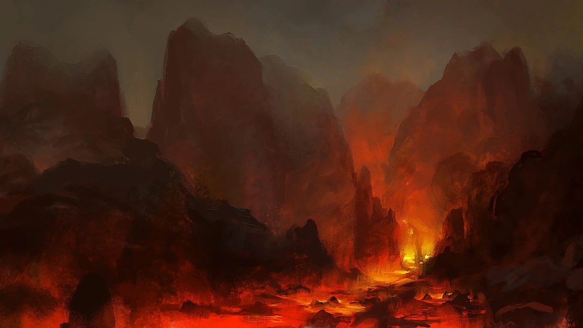The mountainous terrain coupled with the magmatic wake of the Basalt Walker makes for difficult travelling. Magma lakes fill the landscape, as do small shrines to the Basalt Walker that have been partially melted by the heat. Within this area are those who need or worship fire; the Fire Genasai and the Azer are both forced to live here because they need the heat to survive, but for most other creatures, this heat is exhausting to travel through.