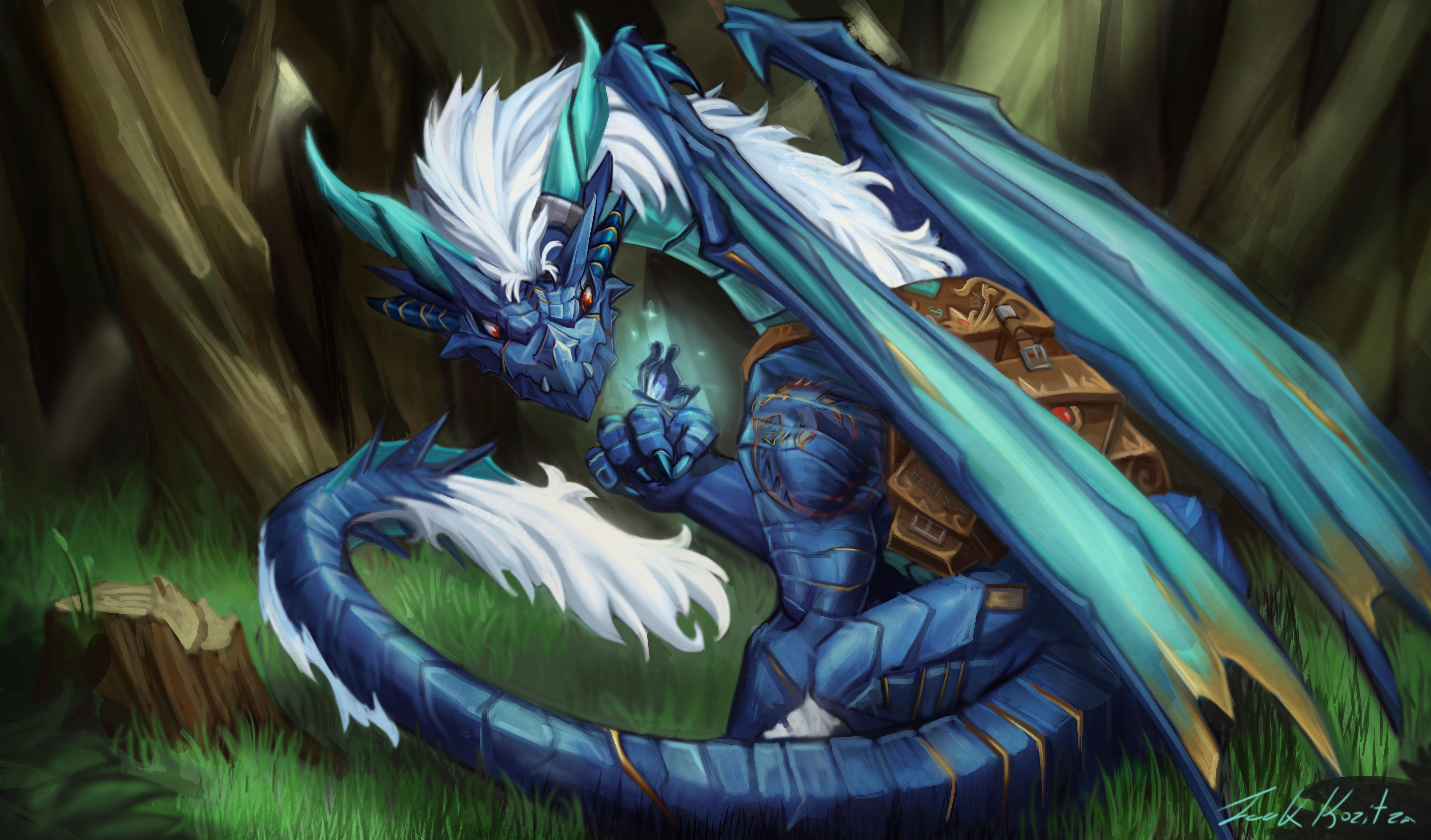 The azure dragon studies the wizard's arcane runes, his companions waiting close by. Jotting a note down in his beloved journal, he inhales deeply, leeching the magical energy right out of the protective ward. With a satisfied smirk, he leads his companions deeper into the wizard's sanctum.