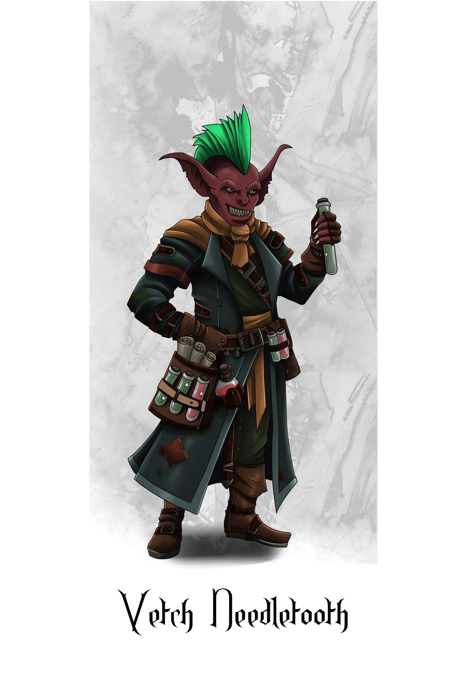 A goblin capable of creating highly potent poisons and other potions. He experimented a lot with different ingredients, is a master poisoner and uses his potions to adapt to any situation during battle. He uses the potions to damage opponents, to gain a breath weapon attack, to buff his allies or to buff himself.
