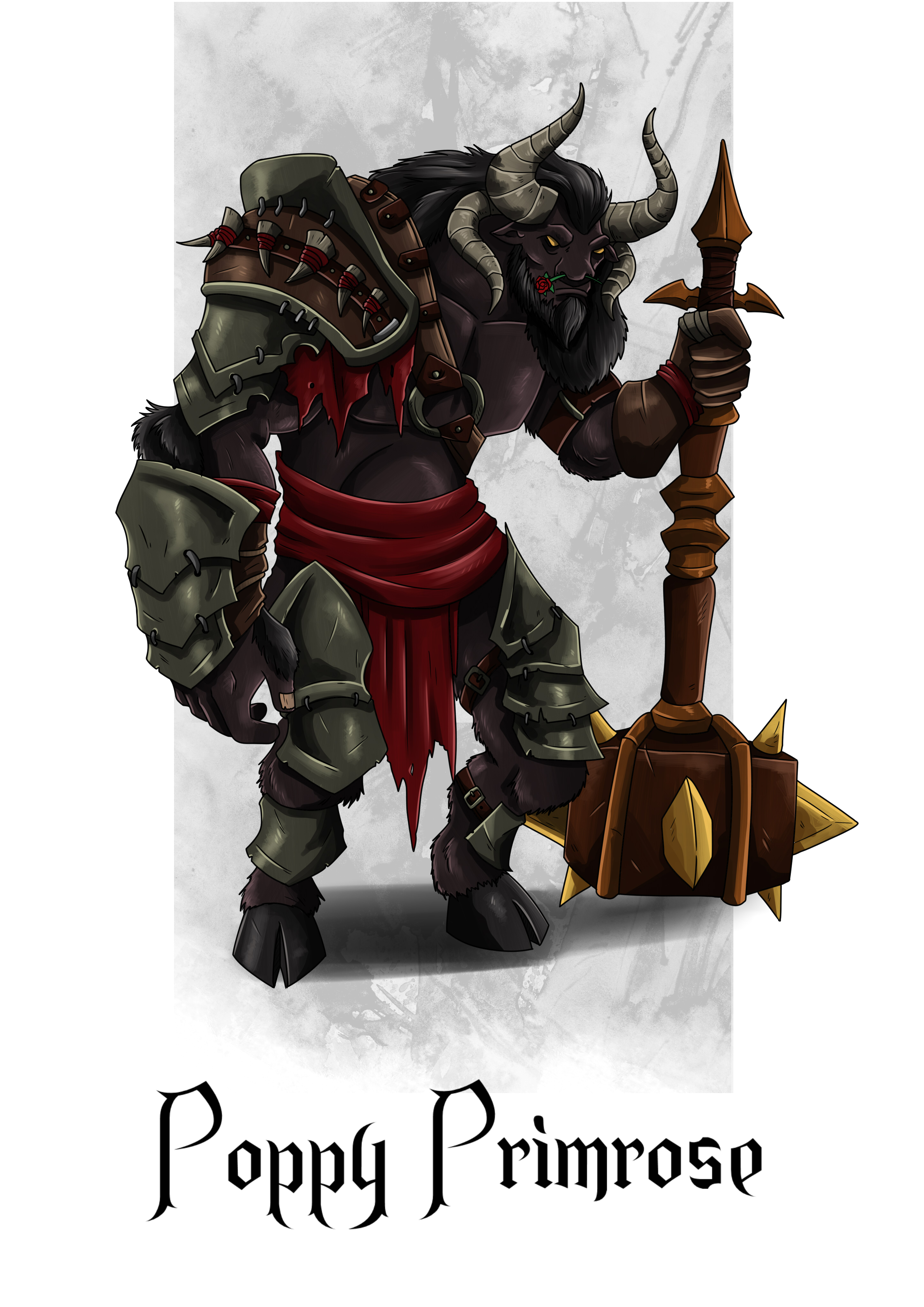 A minotaur who begins any fight with his armor intact. However, with every attack made against Poppy, he loses some of his armor, which magically raises his AC and improves his movement speed. His hammer has a very high damage output and he can shatter the ground, creating an earthquake in an area he desires.