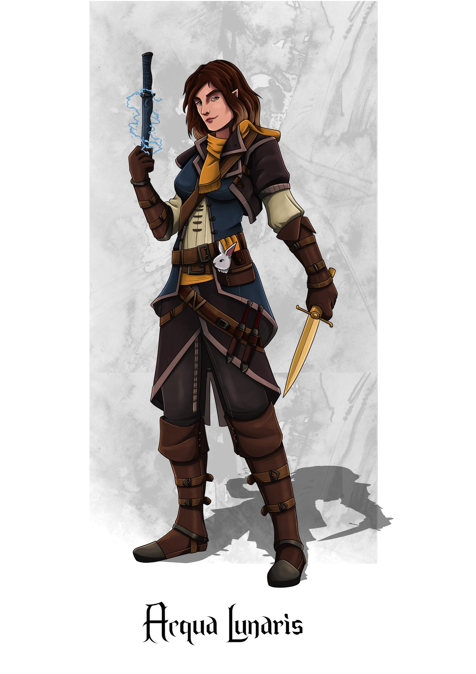 A deadly woman dressed like a shadowdancer. She is an arcane trickster and is constantly surrounded by floating blades. They are the size of big swords and move with Acqua every step she takes. They hurt anyone who comes too close to her automatically, without an attack roll; the opponent is allowed a dexterity saving throw, however. Any melee weapon used in her vicinity by an opponent will turn against the opponent and attack them.