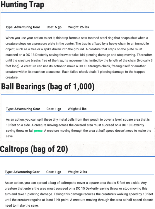 Starting at 3rd level, when you use caltrops, ball bearings, or hunting traps, you add your proficiency bonus to the item’s saving throw DC. Some of your features refer to traps; caltrops, ball bearings, and hunting traps are considered traps for you. Traps you set gain several benefits: