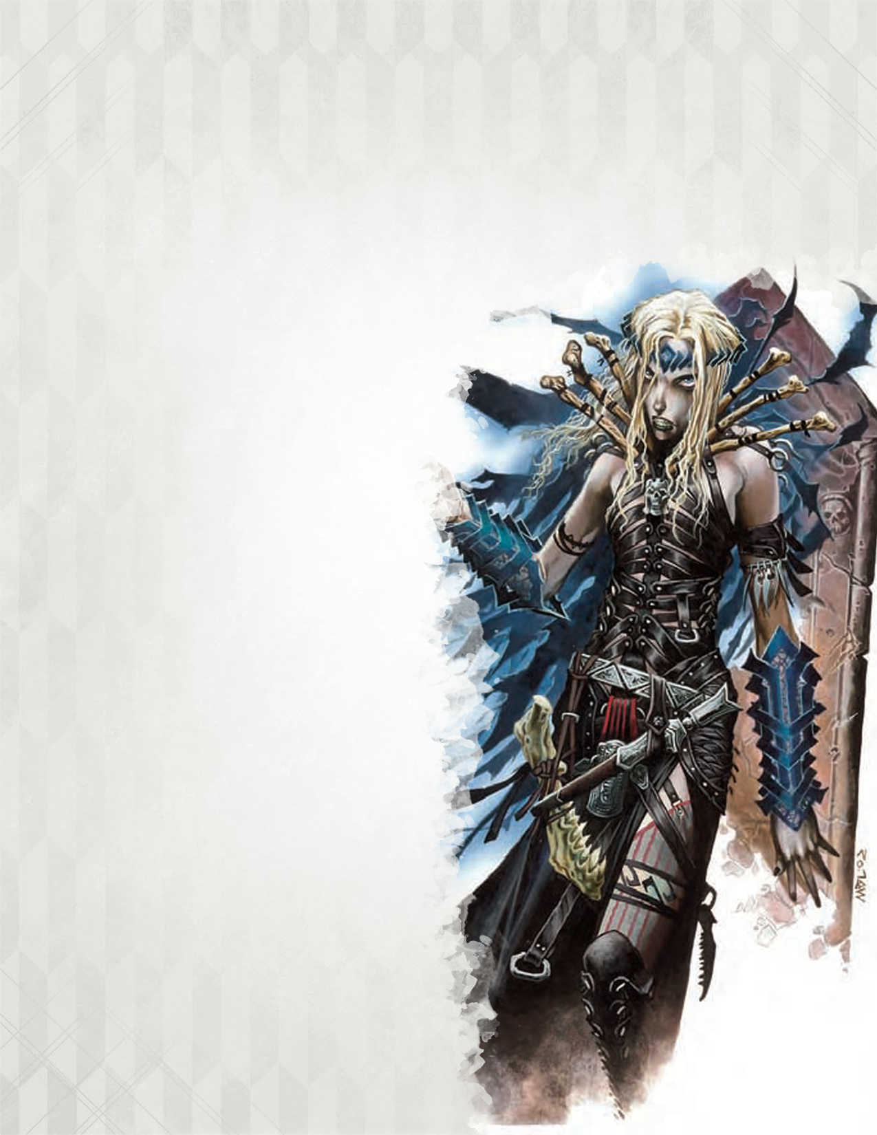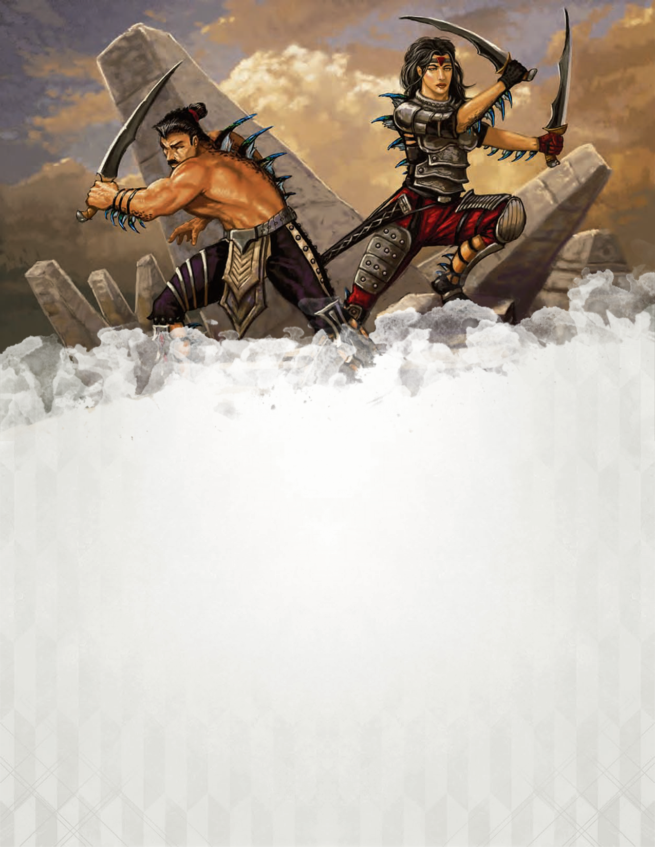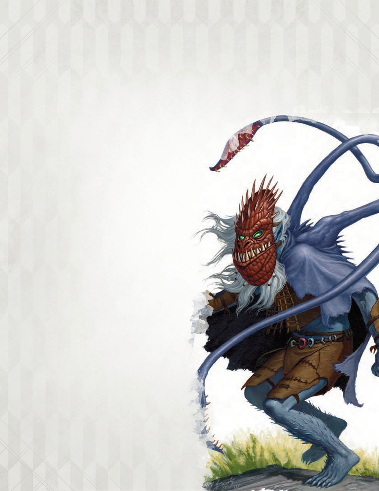 Skarns are proud, sophisticated warriors who constantly strive for perfection of form. With a height of about 6 feet and a weight of approximately 210 pounds, a typical skarn is significantly more massive than an average human. Skarns adorn their spines with jewelry, and even in everyday circumstances they keep these natural weapons polished and sharp.