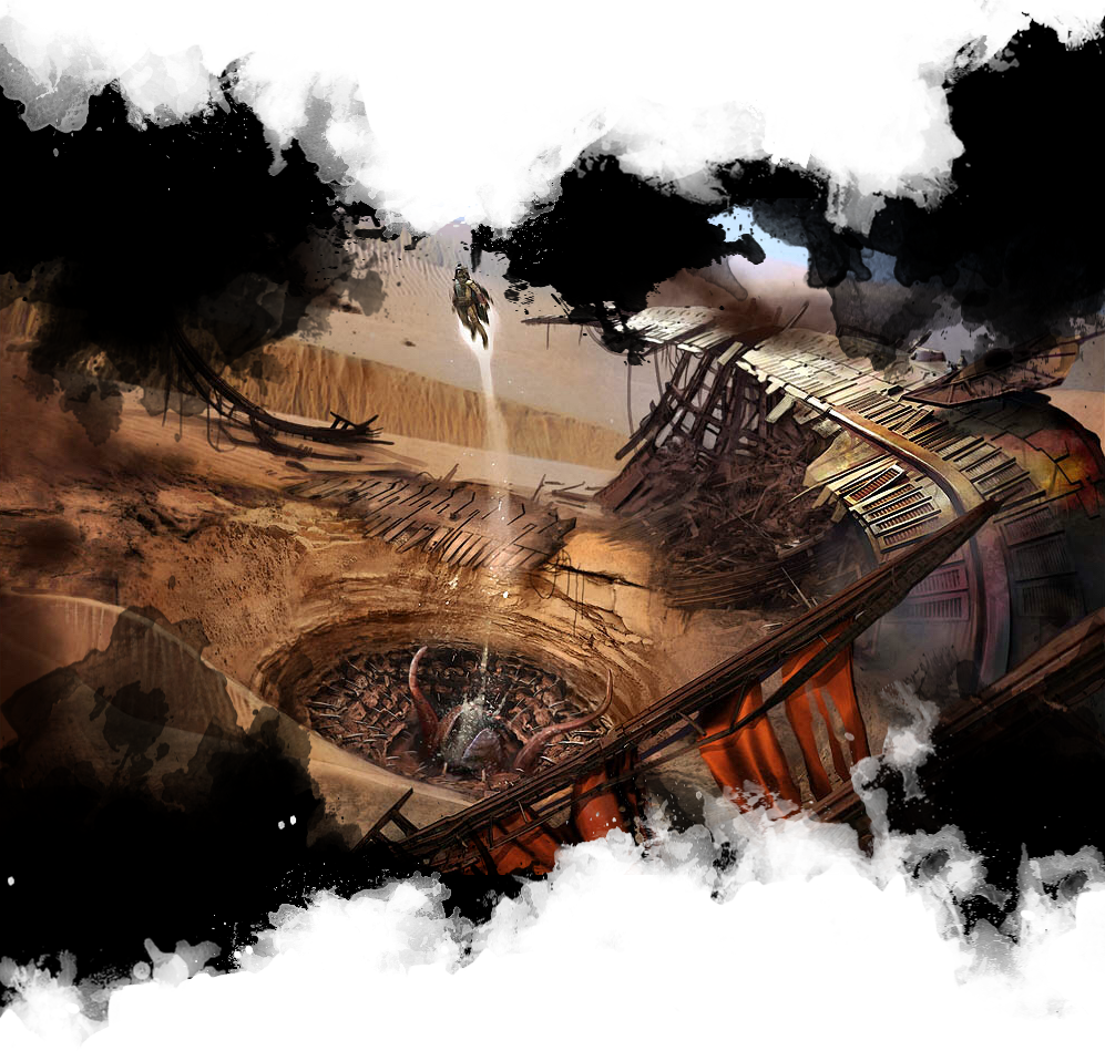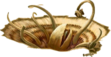 The Sarlacc is a creature beyond most mortal understanding or ability to study. What is visible from the surface is a nest, or rather, a pit, spattered with copious numbers fangs whose length are measured in feet, and one to two dozen tentacles reaching up to 15 ft. in length. At the bottom of the pit lays a bulbous beak protruding from the ground exuding a strange mix of scents, which periodically screams out, calling it's displeasure to the world.