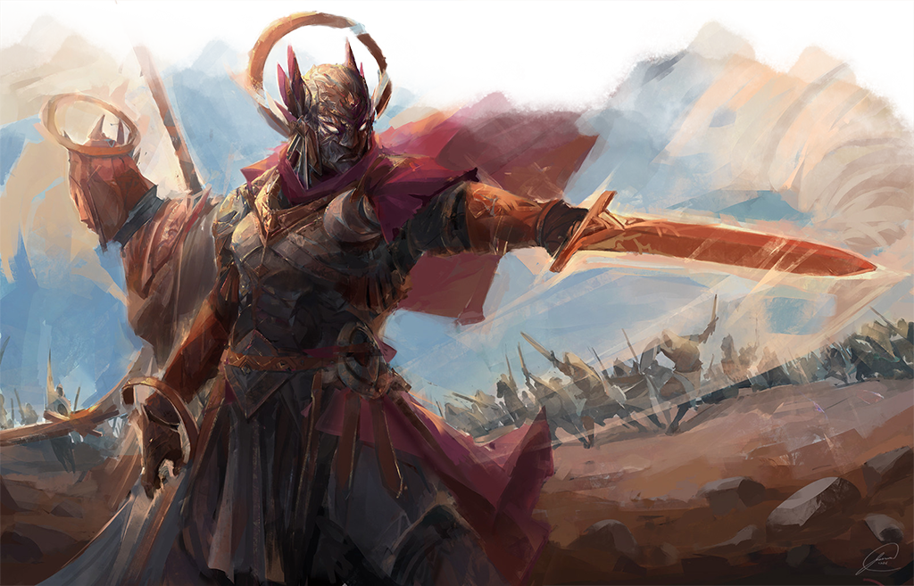A commander leads at the front of a group, using their voice to mold the flow of combat. Despite being fully capable swordsmen, commanders shift some focus away from their own fight to aid others. Commanders rally their companions under a common cause, and their might both inspires allies and demoralizes enemies. If all else fails, a commander can rely on their strong armor and stronger heart to defend themselves from harm.