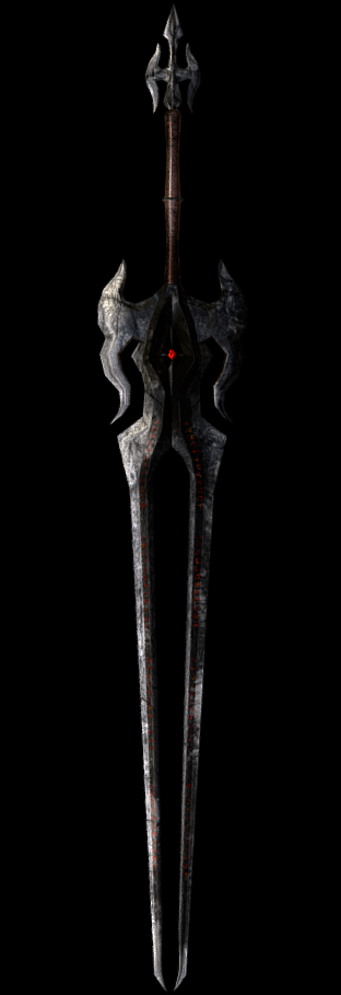 This massive darksteel greatsword is scarred and pitted by countless marks from previous battles, and the weighty blade, standing as tall as a person, is bifurcated into two rune-scriven edges, the inner sides of which are marked by conspicuous burn marks. At the center of its hilt, a baleful ruby is clasped tightly, shimmering with inert power. A detailed inspection of the weapon reveals it to be ancient beyond measure, yet strangely resilient to the passage of time.