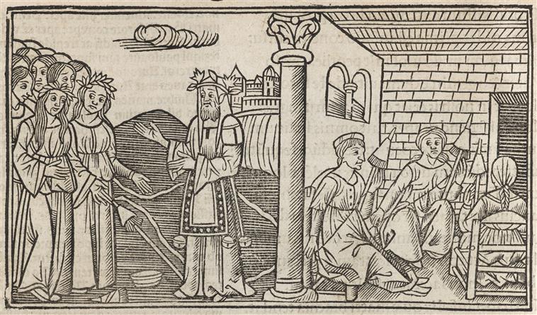 the shafts are iron-bound, and arrows are the shuttles.