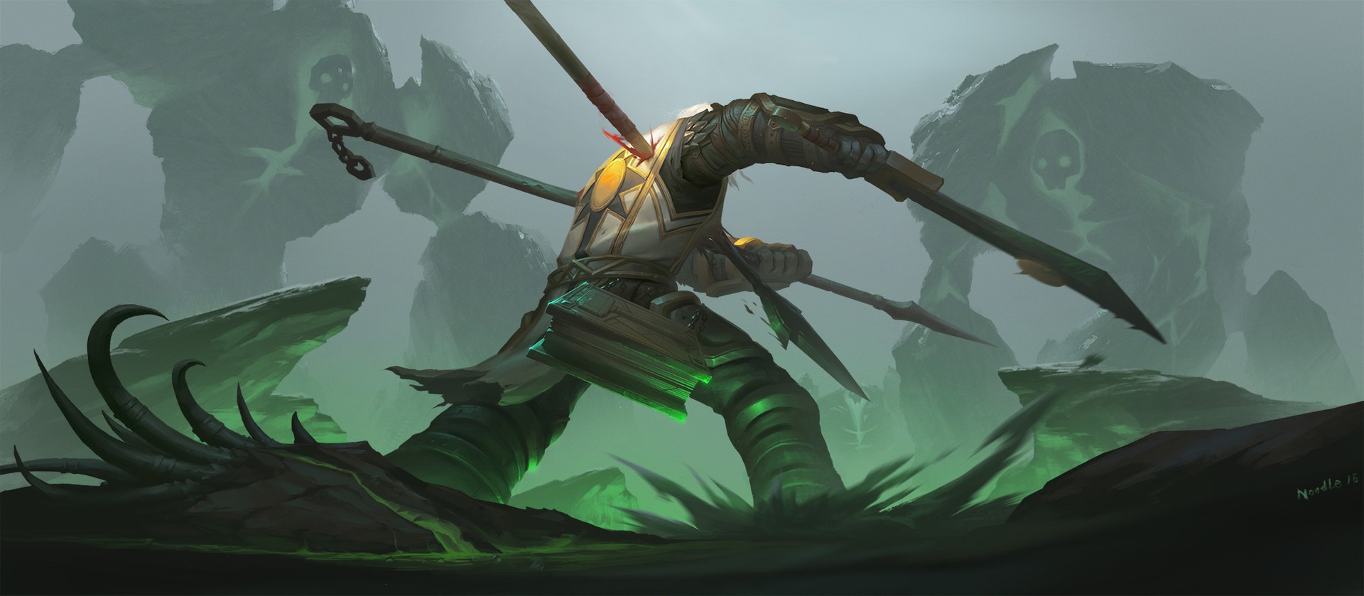 His silver hair shines in a shaft of light that seems to illuminate only him, a blood elf laughs with exultation. His spear flashes with radiance as he jabs it again and again at a twisted demonic giant, until at last his divine light overcomes its hideous form.