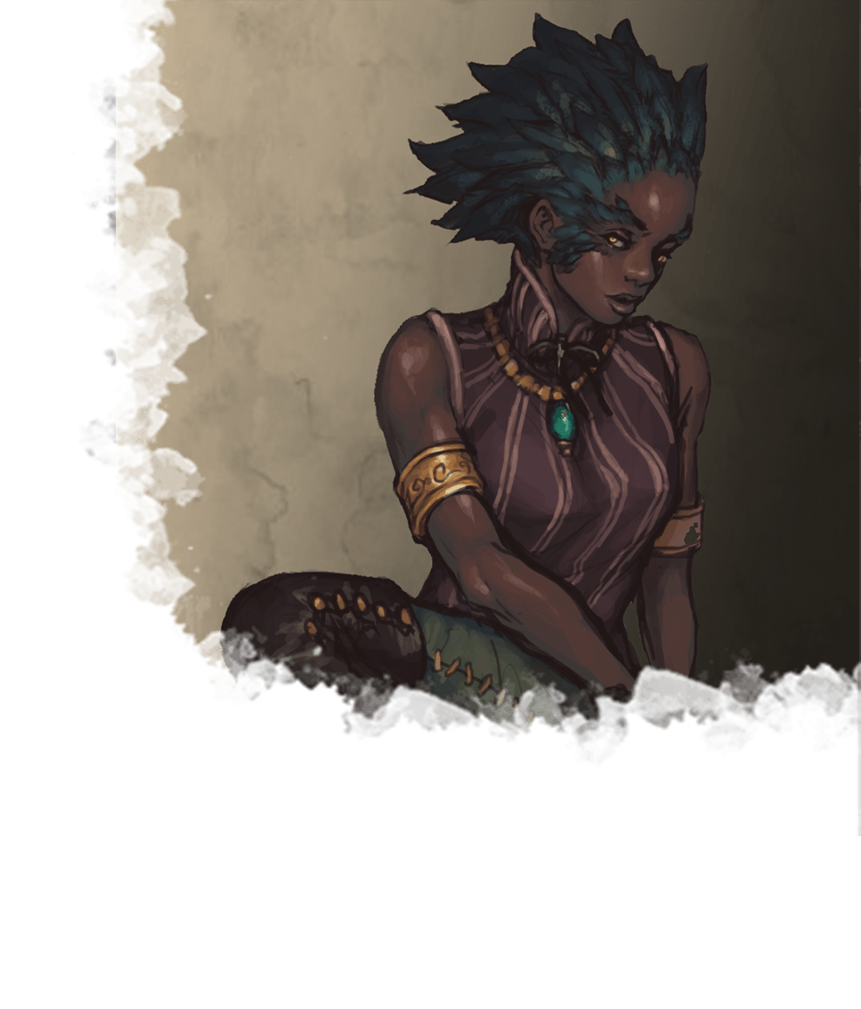 Storm genasi are the wild and boisterous relatives of the more common water genasi. Water-dwelling individuals born within the Sea of Worlds, these genasi are wholly unpredictable, quite literally displaying vast shifts in appearance and personality based on the weather. Their skin matches the multitude of ocean hues, from a darkened grey on cloudy days to a bright cerulean in sunlight. Storm genasi always carry the faint smell of petrichor. During lightning storms, the eyes of storm genasi illuminate with a pale yellow glow.