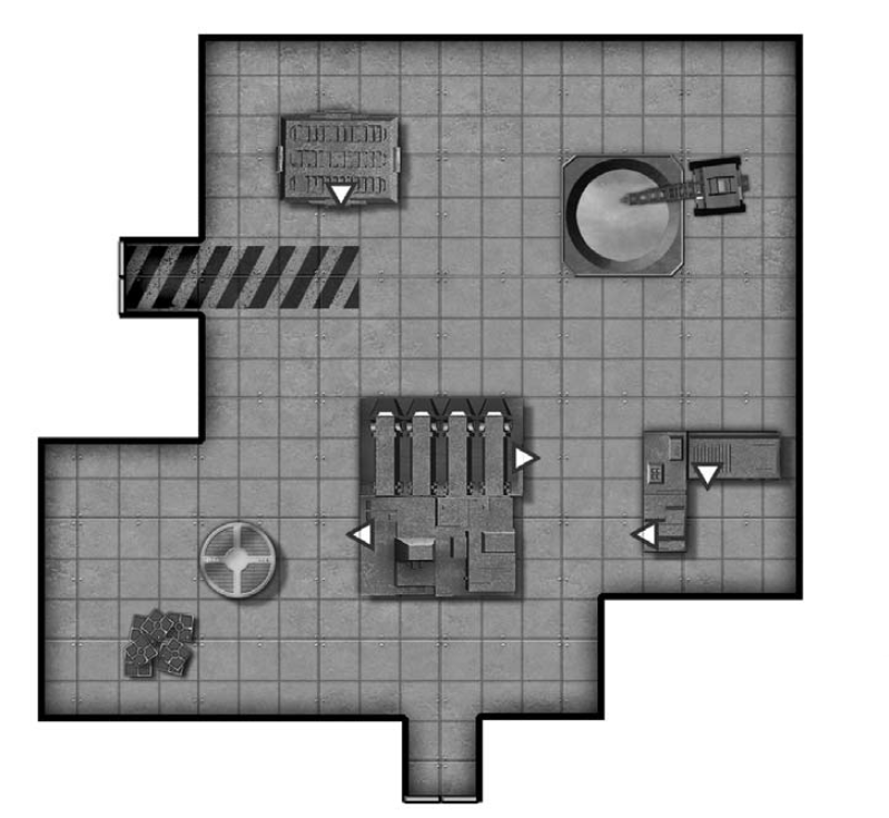The encounter begins with the Ugnaught riggers spread out across the refinery floor. The Ugnaught boss stands next to a Tibanna gas container being raised up from a lower level. All of the Tibanna mynocks are clinging to the gas container, though they need not be placed on the map until the first round of combat, when they are startled into action by the Ugnaught boss. The boss should be in a position to have either total cover or improved cover from the players.