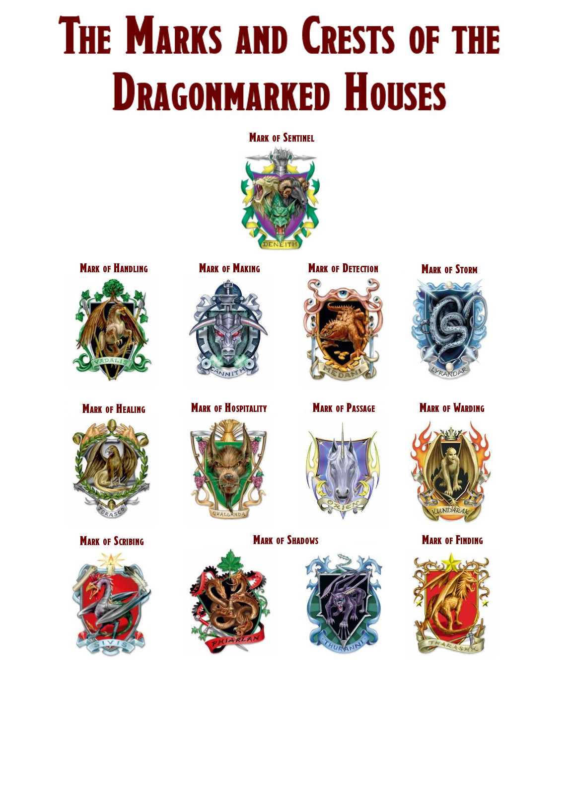 Emblems. Each dragonmarked house has an emblem, a distinctive symbol that features on their heraldry, official seals, crafted goods, and anything else that warrants the house's stamp of authenticity. Each house's emblem appears along with the related dragonmark on the following pages.