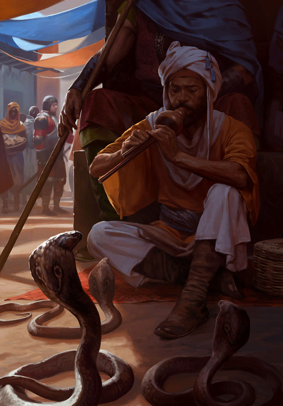 Trained in the art of poisoning, bards of the College of Serpents make for efficient mercenaries, assassins, and spies. The College of Serpents has an infamous reputation due to the grim nature of its work, its members often feared as murderers or usurpers by common folk. Equipped with a silver tongue and a venomous touch, they excel at infiltrating societies and organizations to get closer to their mark. Disciples of this college are taught to ensure that their final blow to their unfortunate victims is cruel and internal, unseen by any onlookers. When a noble drops dead in broad daylight, unable to breathe and drowning in his own saliva, it's not uncommon to spot an inconspicuous snake charmer nearby, distracting the crowd as he performs for mere coppers.
