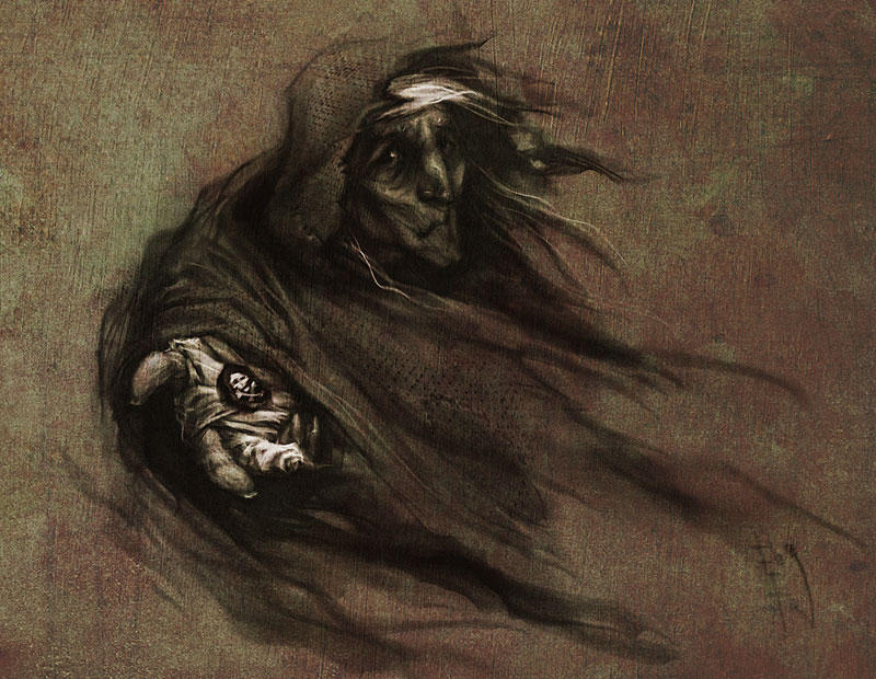 A halfling dances into town, followed by horrific manifestations, while leaving horrid carvings and paintings in her wake, the mad dance to the tune of her song.