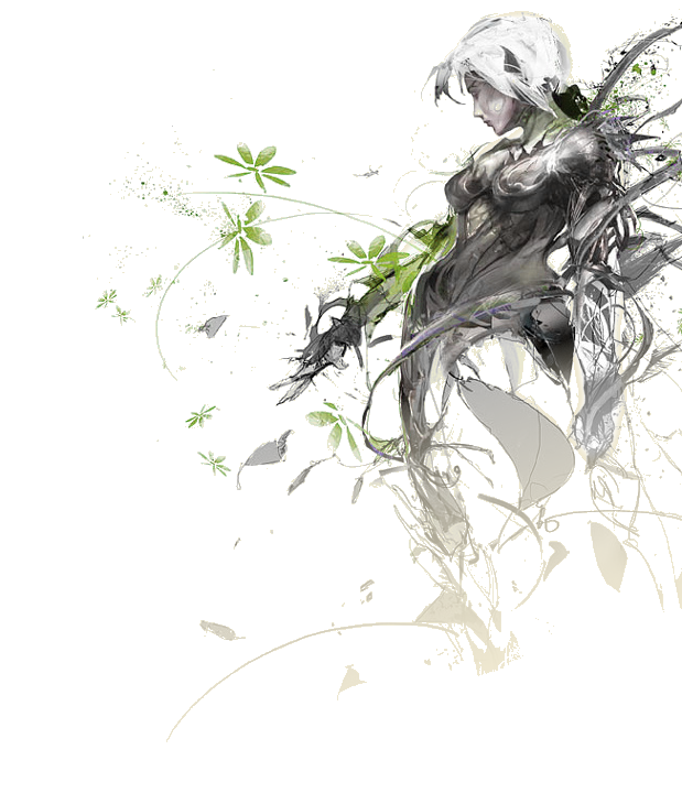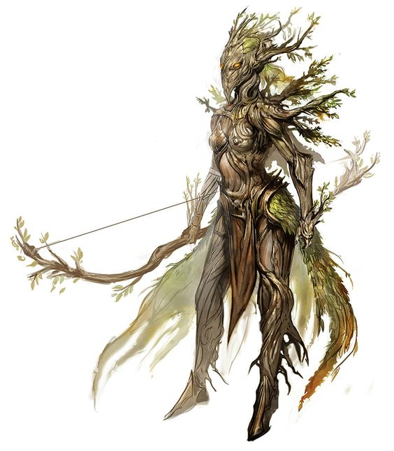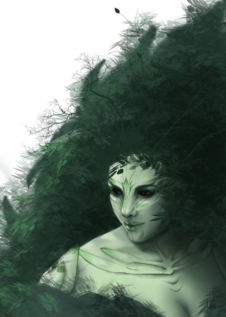 Suddenly there came a rustling behind him, and he turned, readying himself to face some fearsome creature. Instead, he found himself face to face with a woman unlike any he'd seen before: she had large, black eyes and waxen skin that resembled the surface of a leaf. Her hair was formed from flower petals, as were her clothes. She stood still and almost seemed to fade into the forest, save for her the piercing void of her eyes, which met his gaze curiously.