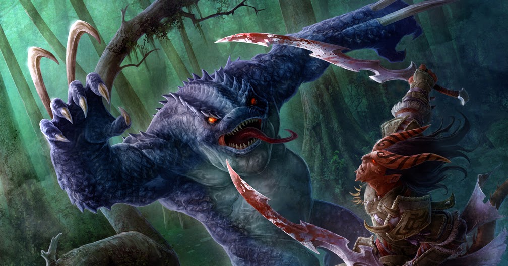 A troll uses its sharp claws to throw a glamorous elf into a pit of acid, ensuring his demise. However, as he slams into the acid, he slowly but surely crawls out, unbothered by the corrosive material surrounding him. The elf's sword then in turn becomes green and corrosive, and the elf counters the troll's attack with a massive swing.