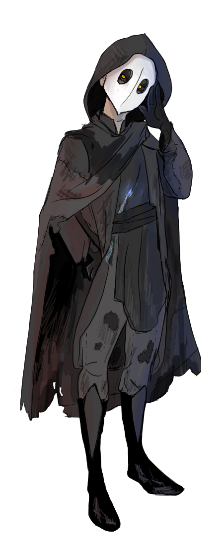 He coughed a bit, noticing the taste of grit in his mouth. He reached up and wiped the inside of his featureless, porcelain mask, cleaning away the residue that had pushed its way in and around the eyeholes and back. Staggering to his feet, he left behind a small humanoid crater in the dirt, surrounded by a ring of scorched earth. Turning slowly, he saw a slightly smoldering scar in the earth, etched deep into the silt behind where he had lain. The progressively widening blemish in the ground stopped at his black-boot clad feet.