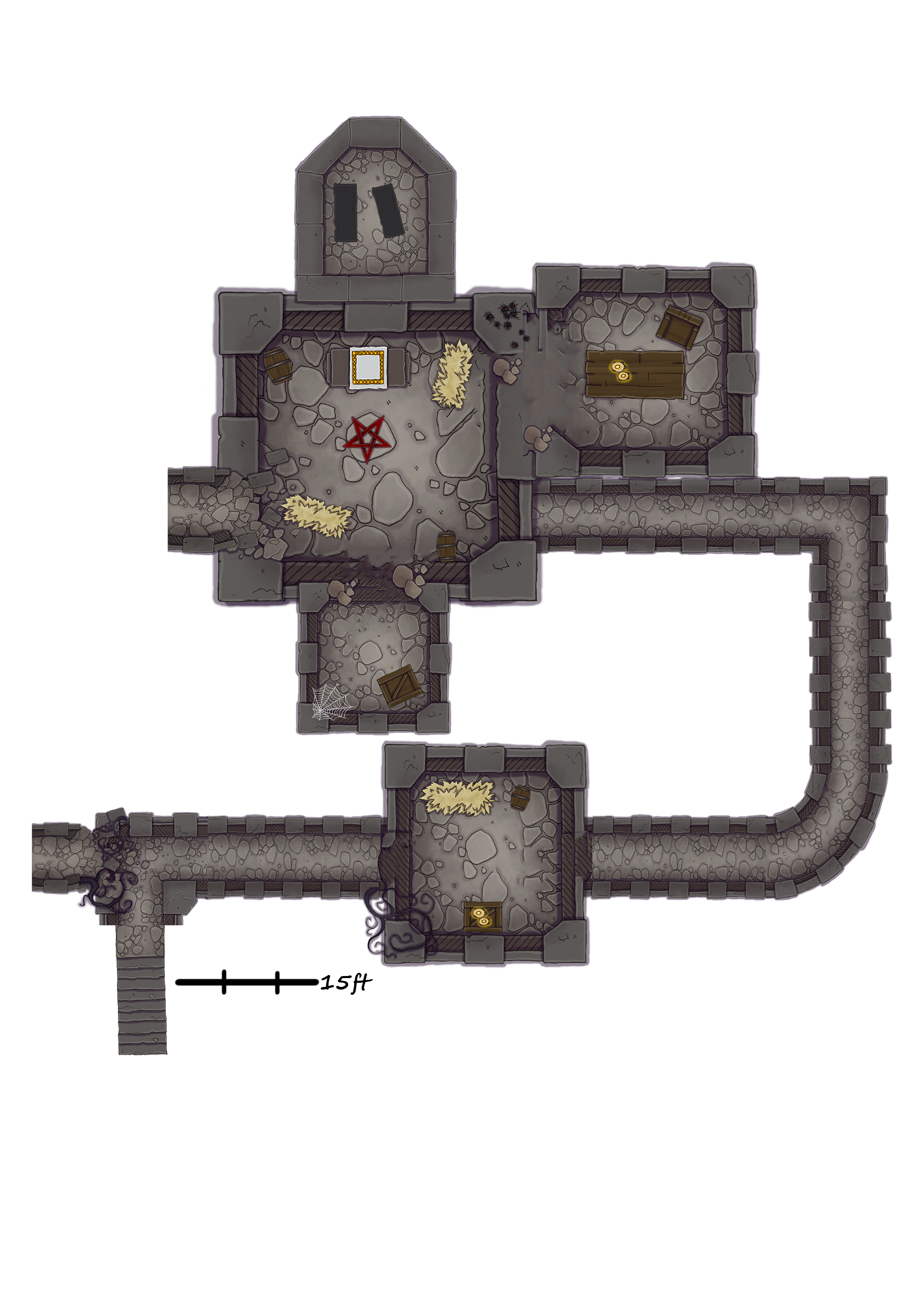 The temple dungeon is under dim light coming from torch wall sconches. Ceiling is 15ft tall and corridors are 5ft wide. Οutside there is an escort of two goblins patrolling the entrance. As they entered the temple they find the following: