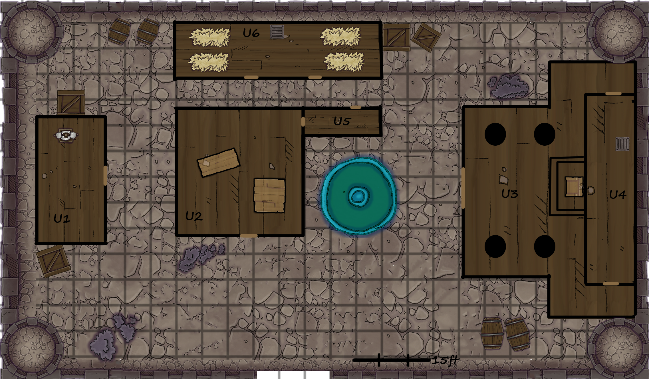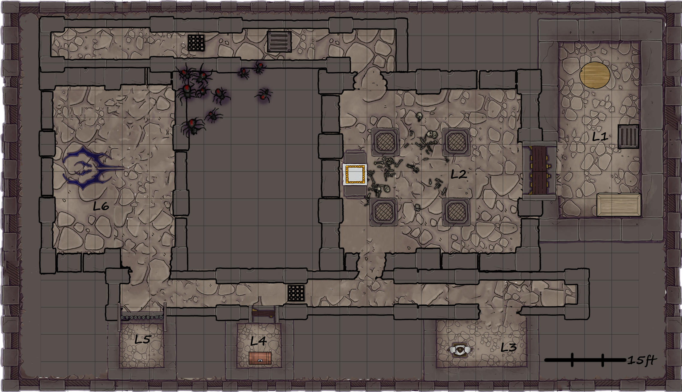 In the 2nd room there are two more goblins and ritual markings in the middle of the room. There are remains of what seems to be a place of a Statue. In the bottom there is a 4 pointed star - sign of Mystryl - and underneath is written “The day only comes after a night”. If the players choose to stay in total darkness they will see that in the back left wall there is a small hole glowing magically and if something is pressed inside a mechanism is triggered. If they spend some time investigating the walls they can also find that hole but only after they succeed in a DC 15 Intelligence (Investigation) check. If they succeed to investigate the wall they can find a small lever leading to a hidden room.