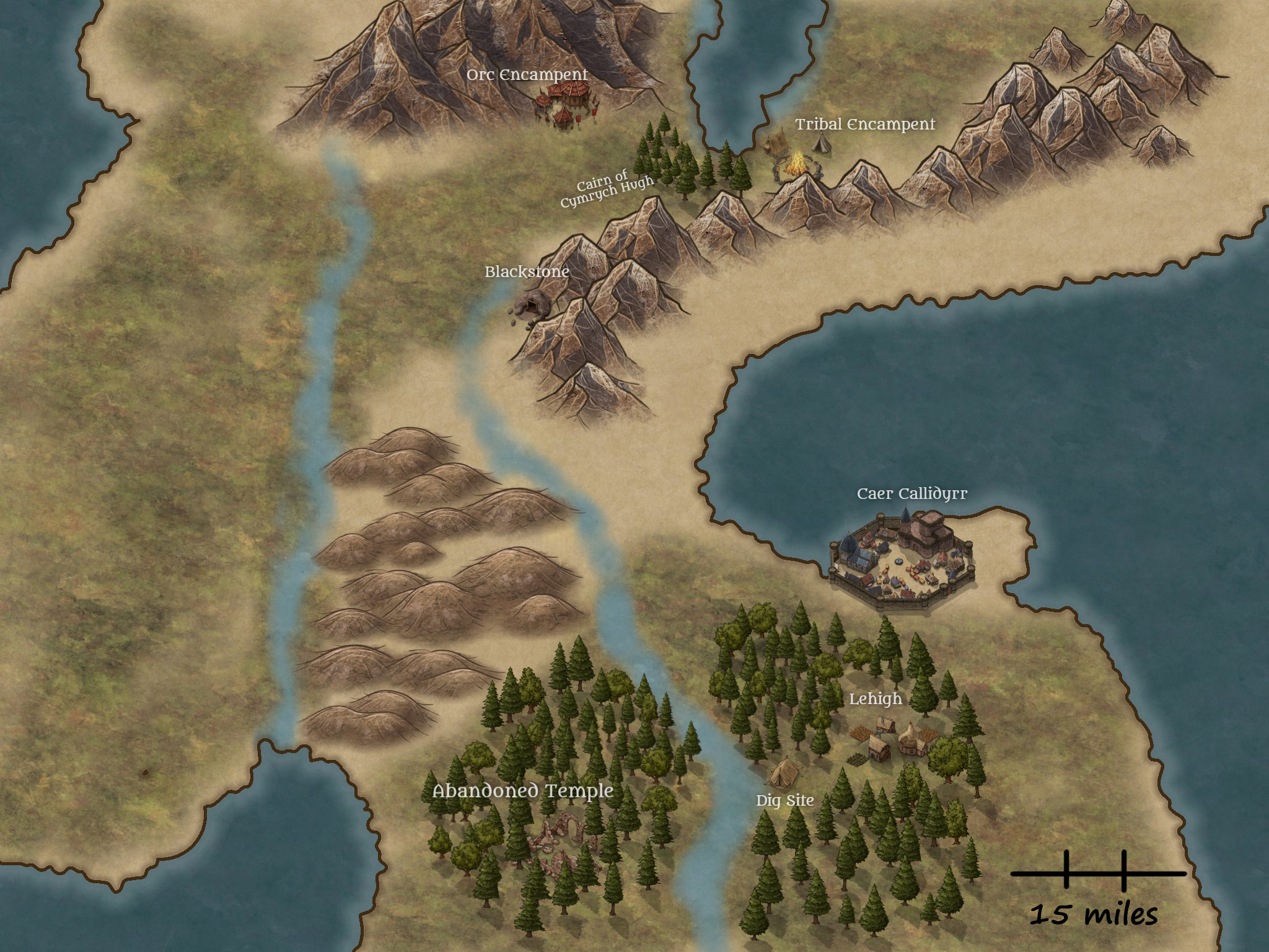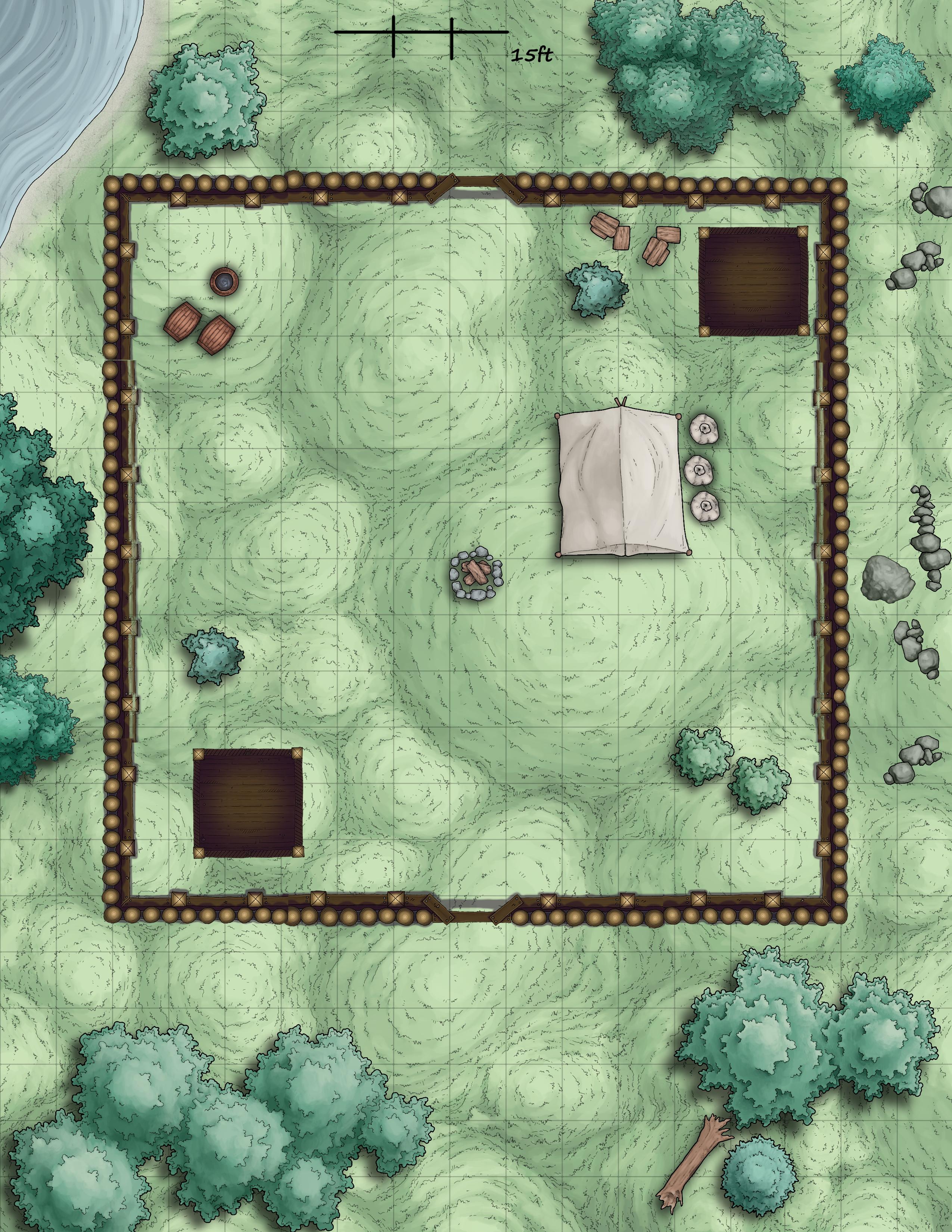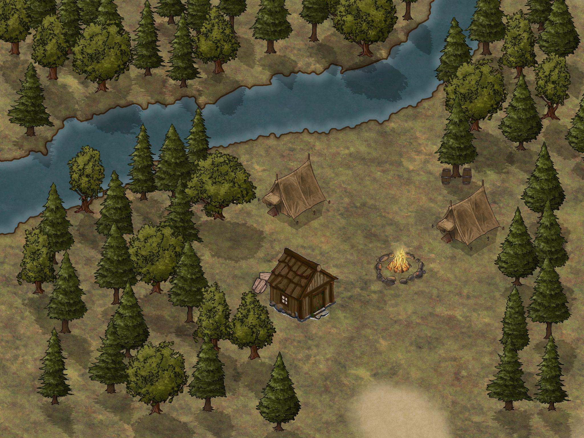 Next to a river bank, a small clearing almost 50ft wide in the river bank that comes down to 20ft in the entrance of the path, our party arrives after almost a day walking on the High Kings Road. It is located 15 miles SW of Caer Callidyr city. As soon as they arrive, the workers place two marquees and there is also one small wooden hut that hunters occasionally use while in the woods. The place can be lightened during night by small torchers and oil lamps that can be found inside the hut. Also there is a small chest containing 2 healing potions, a dagger and a rope. The cart that arrives with the adventurers has water and food supplies for 4-5 days and mining equipment.