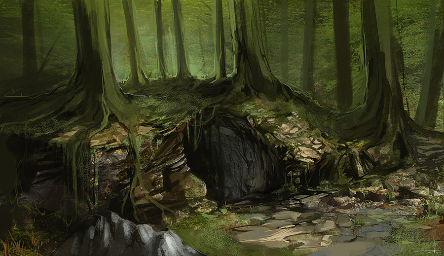Adventurers will be travelling about 15 miles inside the forest south of the excavation site. The forest is quite dense and the further you walk towards the center of the forest the more dangerous it becomes. A character who succeeds on a DC 10 Wisdom (Survival) check can find small feet tracks. Following the trail of tracks they vaguely see some ruins that are almost covered by many leaves and branches as well as old trees with roots on the ruins’ stones. A small entrance can be seen with low light coming from inside.