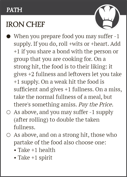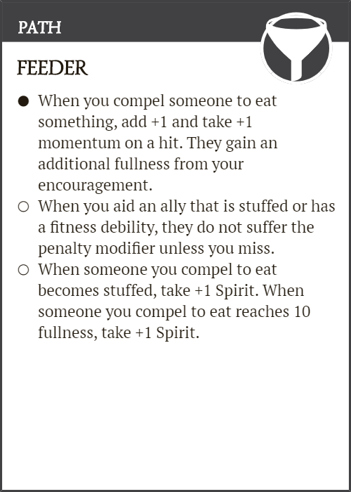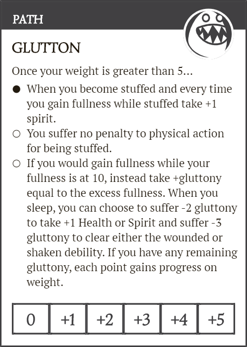 A character's fullness track describes how much they've eaten recently. Progress is gained on this track when eating food, typically in such a way that would decrease supply. Progress is burned on this track any time considerable time passes or when extreme physical effort is spent. Any progress gained is 1 box. Any progress burned is 1 tick.