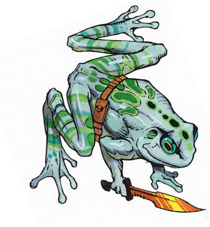 Grippli bodies are shaped like those of frogs, except for human-like hands and hand like feet. Their eyes are yellow with vertical slit pupils. Grippli skin color varies dramatically depending on their environment, ranging from the brown-splotched green of swamp grippli to vibrant blues, yellows, and reds of rainforest-dwelling tribes. Although their skin looks wet and shiny, it is actually dry to the touch, but they still smell of old, wet vegetation.