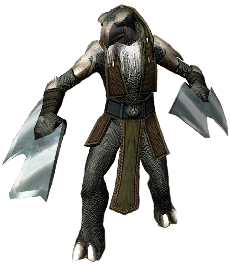 Yam'rii, also known as Huk, are a sentient species of insects with mantis-like bodies, large, multifaceted eyes, thin torsos, knobby carapaces, and pointed feet. Their arms are shaped like giant clippers: the upper limb has a barbed, serrated cutting edge on its underside, and the lower part of the limb narrows to a point; together, both halves act like shears. They are strong, burly creatures, although they remain stealthy despite their size. Yam'rii are carnivorous, subsisting on meat and eggs—and, according to rumor, their own kind.
