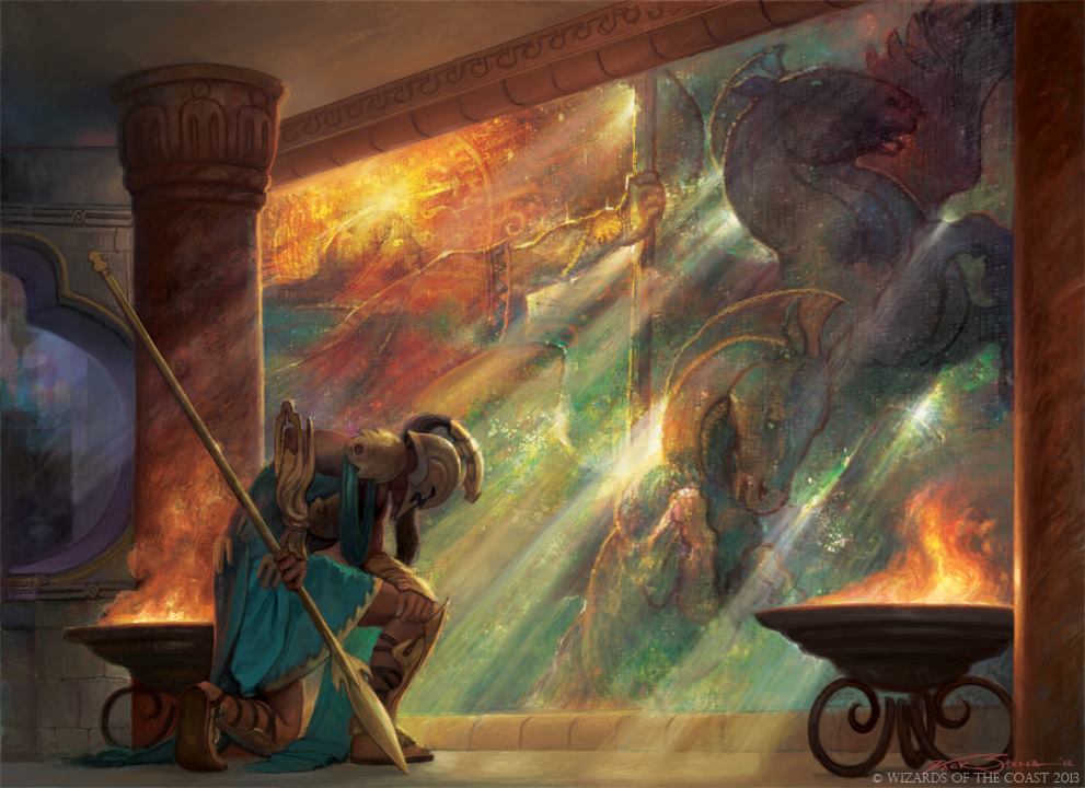 Theros is set in a world akin to ancient Greece. Before going any further therefore we should explain therefore that (i) Theros is a low technology world and (ii) the Gods are important.