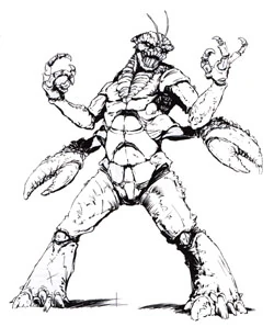 The Tarc are sentient crustacean species native to the world of Hjaff. They once evolved from large sea-dwelling creatures that were forced to adapt to the desert-like environment of Hajiff. With these adaptations they developed a high tolerance for extreme temperatures and the ability to go without fresh water for an extended period of time. Their chitinous exoskeleton allowed them to absorb moisture and control their body temperature while also providing them protection from damage. Tarcs are far heavier and bulkier than Humans and other species of similar size. They possessed two legs and four arms, two that possessed three fingers and the remaining two ended in claws for fighting, as well as two eyes and a pair of antennae on their head. Despite their size they have surprisingly quick reflexes, though they are relatively weighed down and are slow on land.
