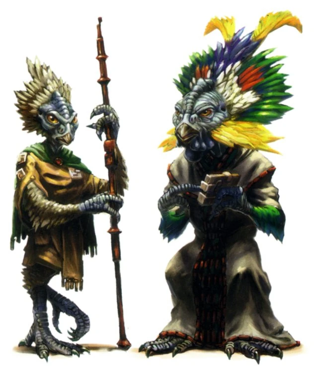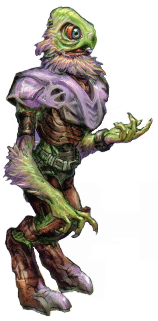 The Kilmaulsi are a flightless avian species native to Kilmaulsias. While their ancestors were once able to fly, the Kilmaulsi retained tufts of feathers beneath the jaw and elbows which are purple in color, though in other individuals they are black. The skin of the species is green with areas of orange around the eyes. Kilmaulsi are very muscular in comparison with other humanoids. As with all humanoids they had two hands and two legs, the former ending with four fingers with sharp talons at the tips.