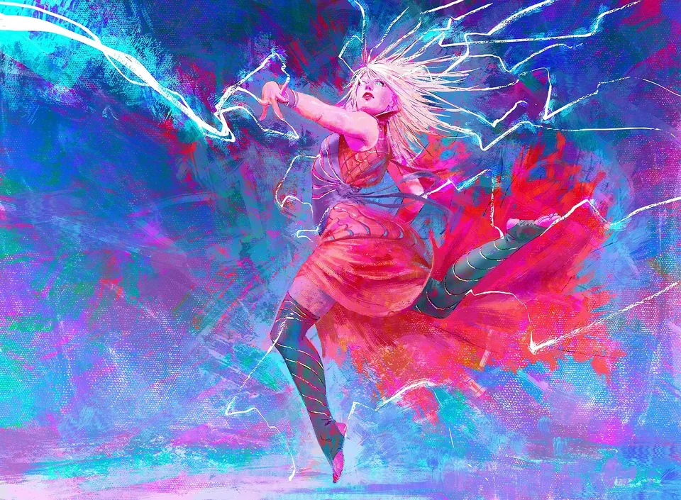 Long hair whipped by a conjured wind, a half-elf spreads his arms wide and throws his head back. Lifting him momentarily off the ground, a wave of magic surges up in him, through him, and out from him in a mighty blast of lightning.