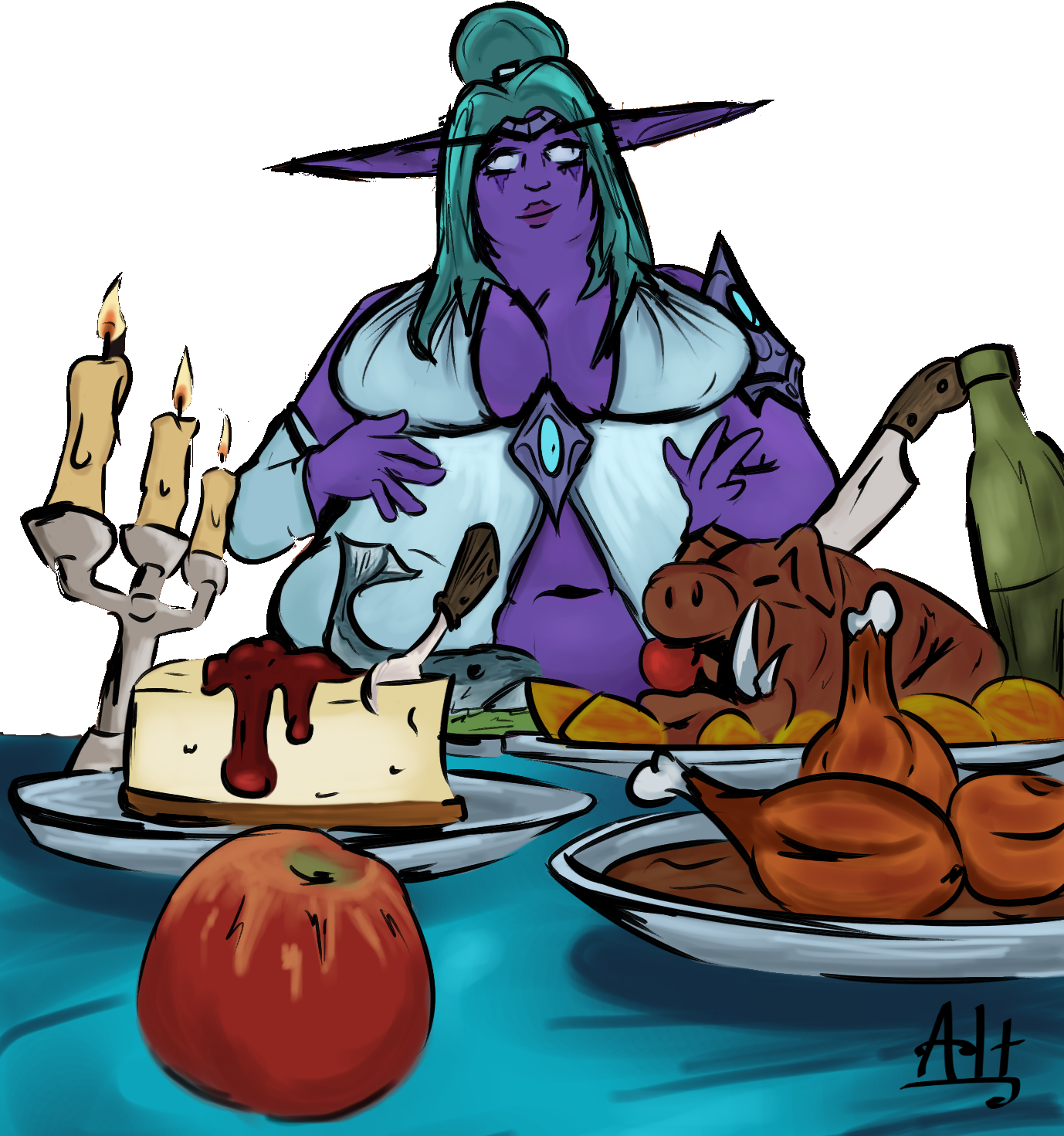 - A large Night Elf by Dwarfpriest (I left the artist's signature, but I had to flip it horizontally due to big hair, so it's not super legible, sorry.)