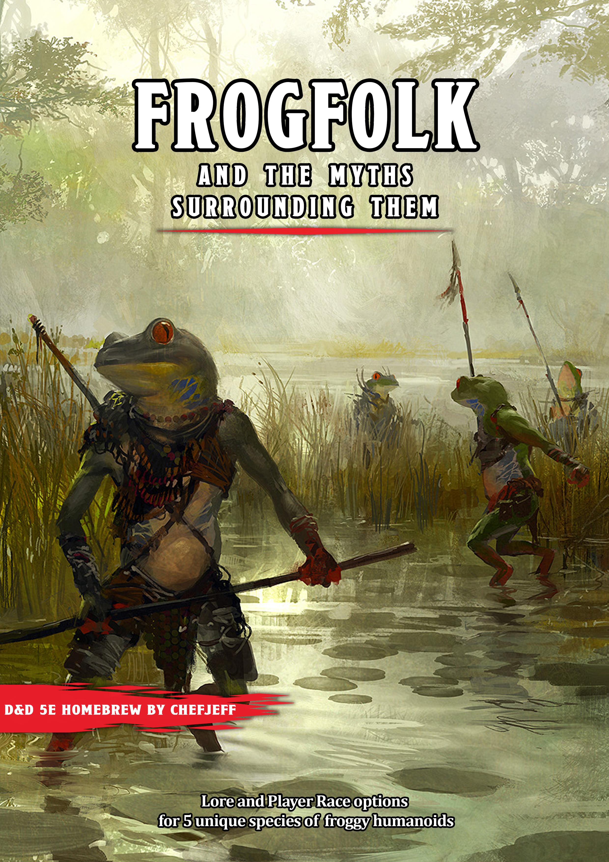 The frogfolk is a collective name given to a host of diverses froglike beings that dwell deep in untamed nature, far from the reach of greater civilization. As such, knowledge surrounding the lifestyle and culture of frogfolk is limited, and only a few of the most seasoned explorers have met the beings in person. Those frogfolk that do wander into the civilized realm are often eager to explore and find fascination at every corner, making loyal and energetic companions.