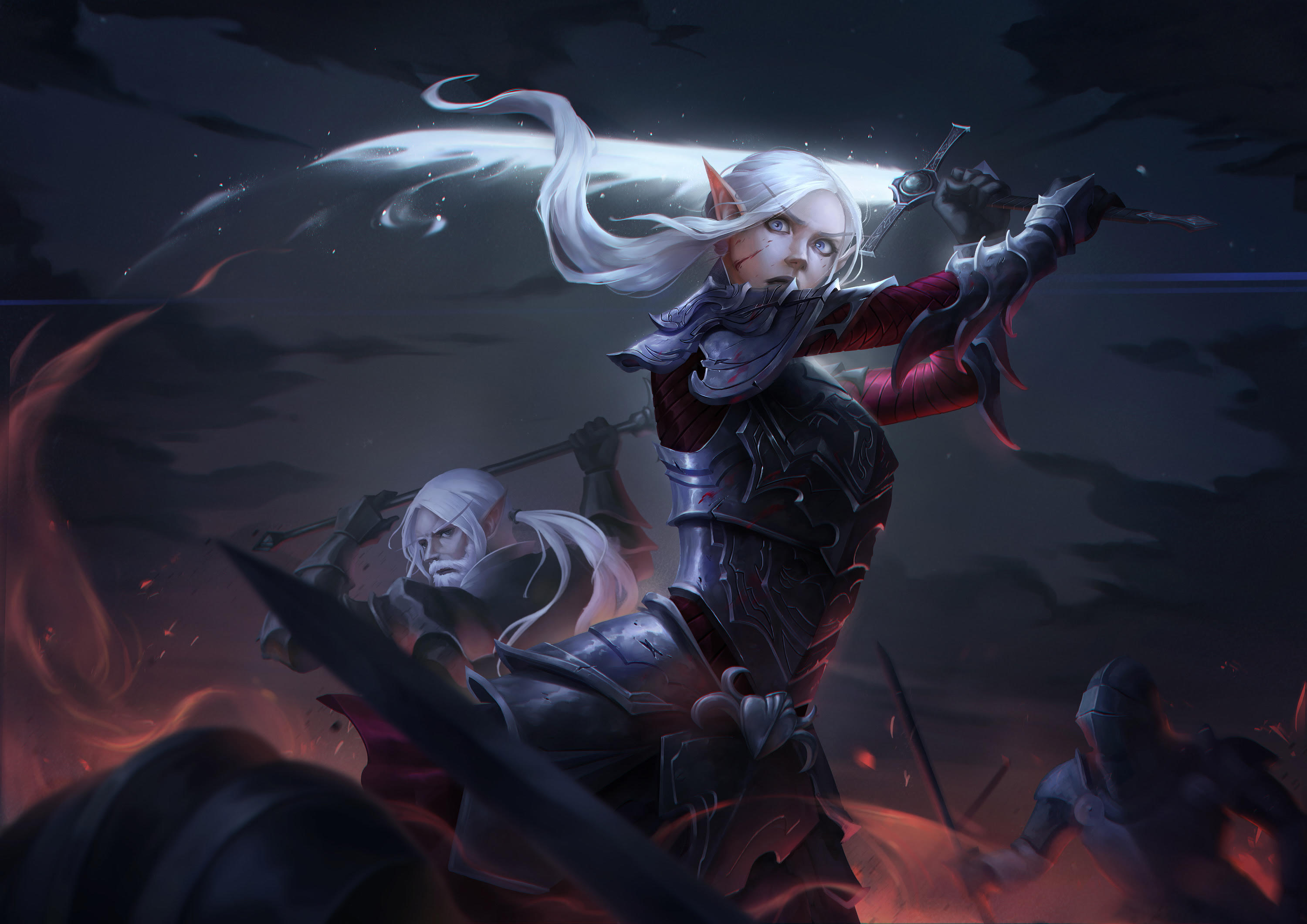 A human runs her hand across their blade tracing esoteric patterns that alight at their touch, flames flickinger alive in their wake casting a sudden blazing light over the gloomy cavern, creatures of the dark shrinking back from the fire's light. A gnome's eyes begin to glow as a massive greatsword of energy condenses into their waiting hand, forming a blade of pure energy, twice their height but weightless in their hands. The edgy elf vanishes from sight, teleporting behind their foe before muttering something cryptically and cutting them down.