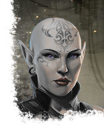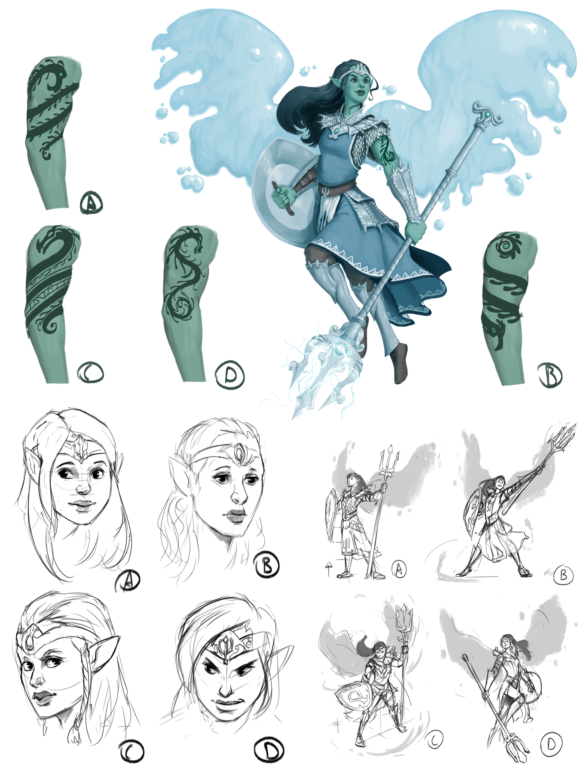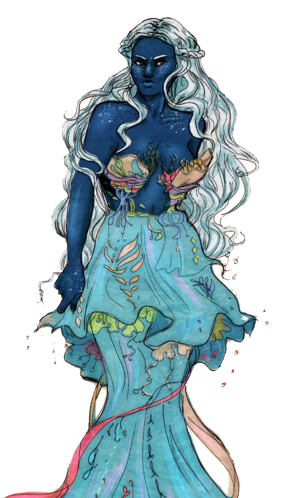 Other traits of hers are being inquisitive, brave, self-confident, calm under pressure, and calculating when it comes to matters of strategy. She can be aloof and detached emotionally, hesitant to let others into her life in any permanent sense. She has a strong sense of ambition and a willingness to forge her own way. She is also fond of showing off her impressive and imposing magical skills. She is tall, but perhaps not as tall as a typical elf. Her skin is sea-foam green that always looks slightly moist. Her long dark hair is black with a blue sheen. Her face resembles the Elven side of her heritage: high cheekbones and arched brows. She prefers to wear bold makeup that enhances her sharp features, leaning into and embracing colors that complement her natural skin tone. She has an athletic build; that of a strong swimmer. She wears clothes that are obviously of good quality but avoids wearing anything with her family emblem unless absolutely necessary to garner political clout. She wields a mace and shield she collected from the family armory before leaving Uthorim.