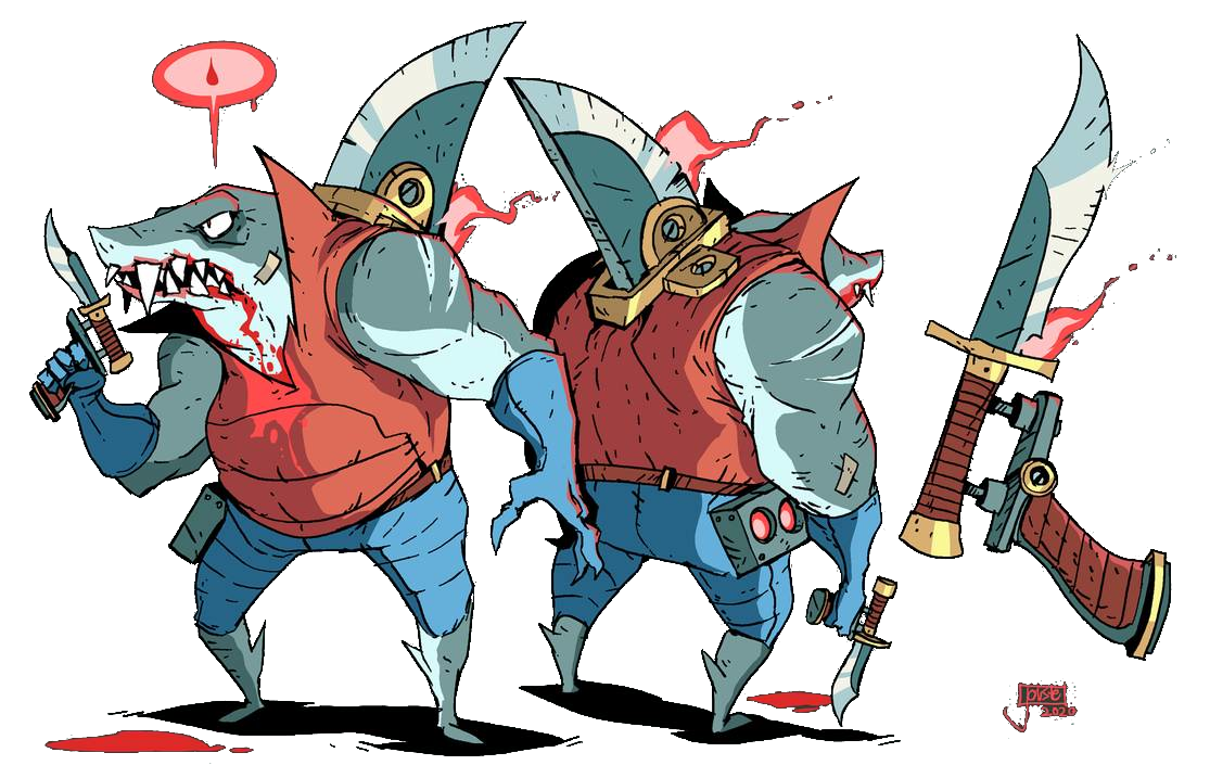 The shark vampire... has arrived! Here he is wielding the "Radslayer" a knife so dangerous that it needs an extra handle! The retractable blade on his back leads to some unconventional attack patterns and his nano-belt is powered by blood!